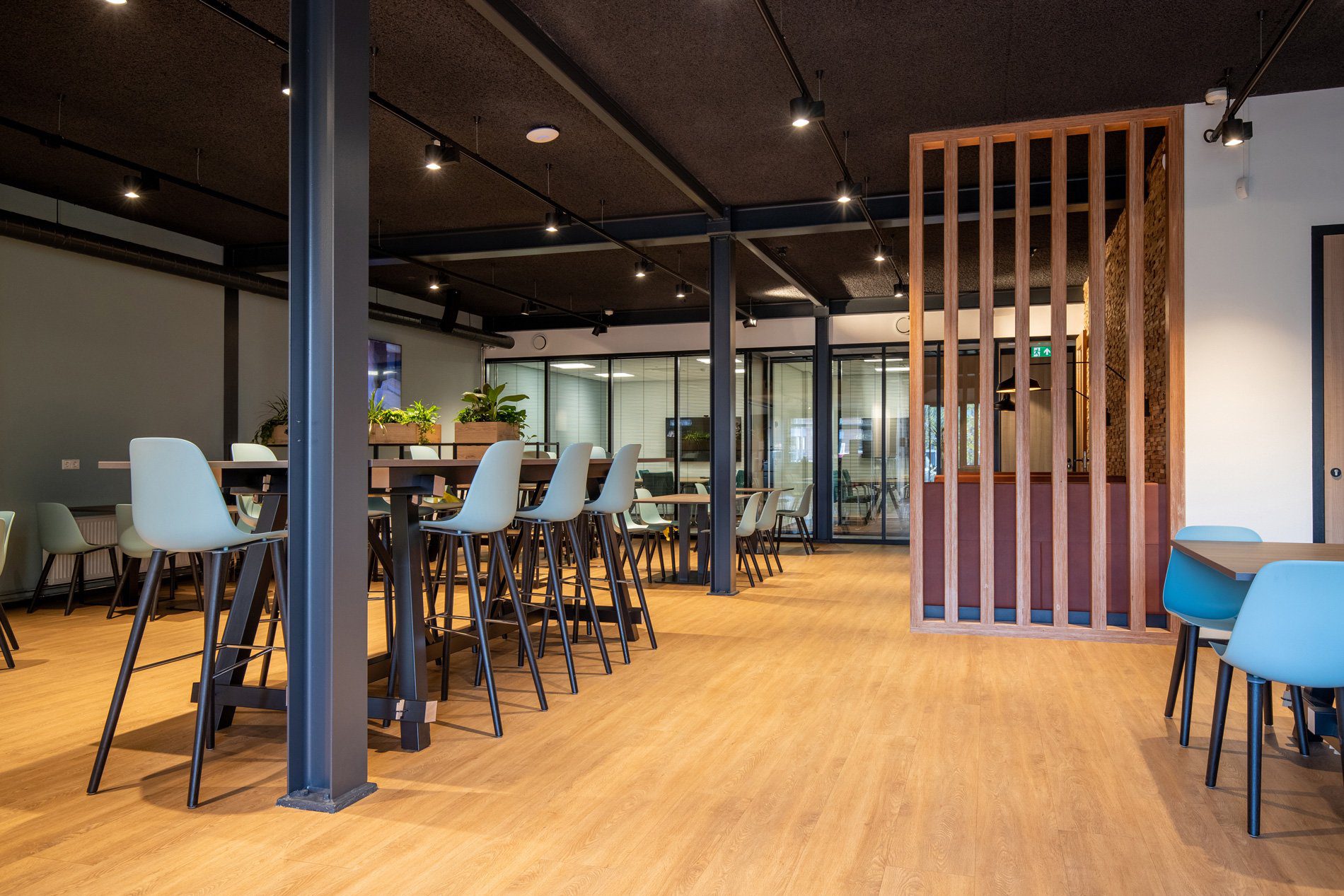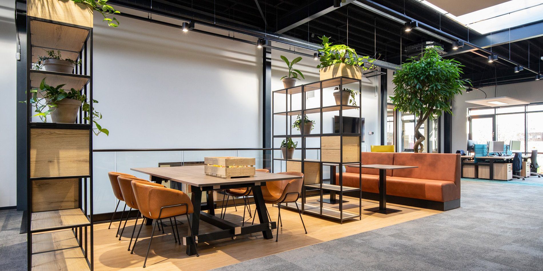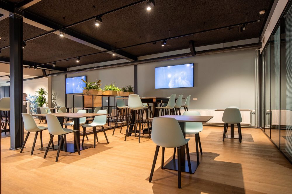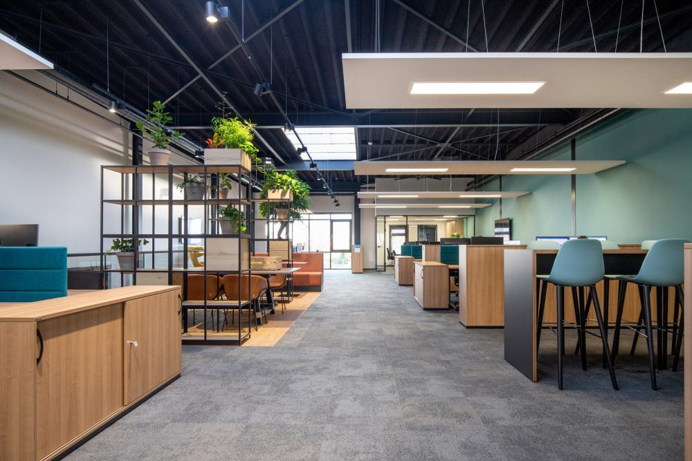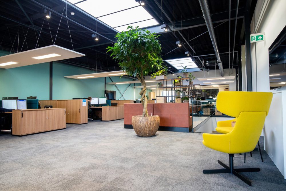 Een loods met hoge plafonds en een grote, massale ruimte verander je niet zomaar in een prettige werkomgeving. Om dat toch voor elkaar te krijgen creëerden we fijne werkplekken, gecombineerd met huiselijke ontspanningsplekken en een kantine. Door het zwarte plafond oogt de ruimte minder hoog. Daarnaast kozen we voor zwevende panelen met verlichting boven de bureaus en zitjes. De diverse open kasten ‘breken’ de ruimte zonder de openheid en overzichtelijkheid van de ruimte te verstoren. In de kantine combineerden we zitjes met verschillende hoogtes en kozen we voor een houten vloer en houten wand voor een natuurlijke uitstraling. Uiteraard leverden we een bijdrage aan een goede akoestiek, mede door het gebruik van vloerbedekking, planten en akoestische panelen.