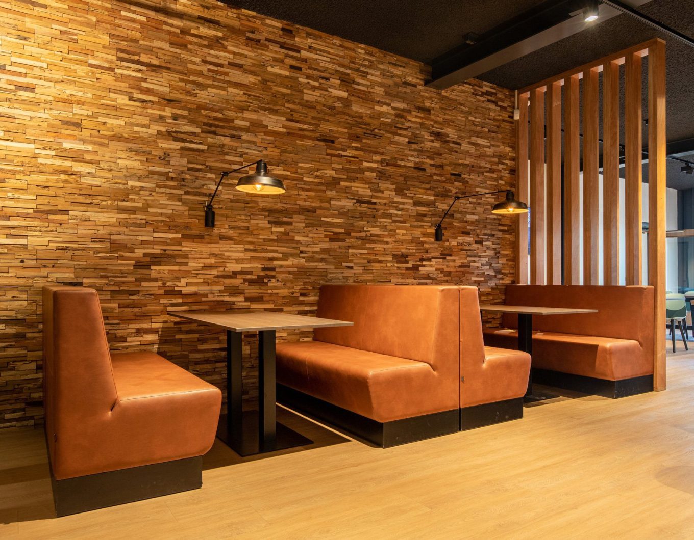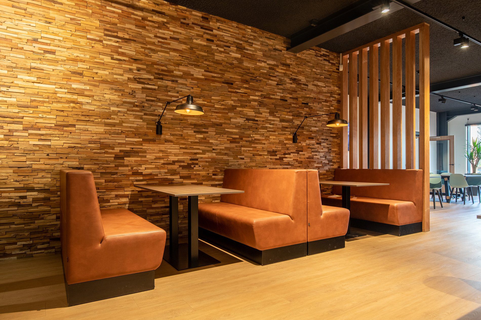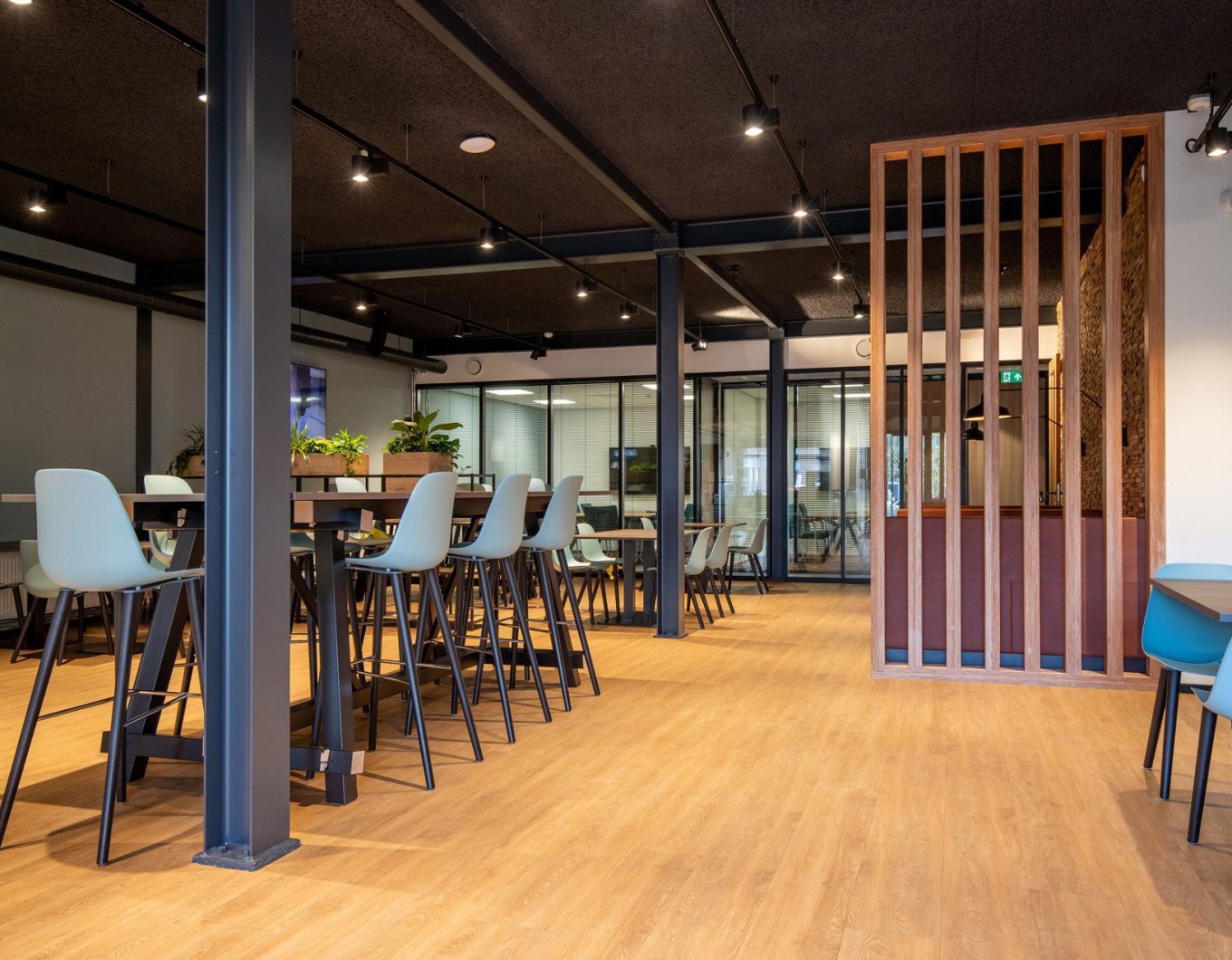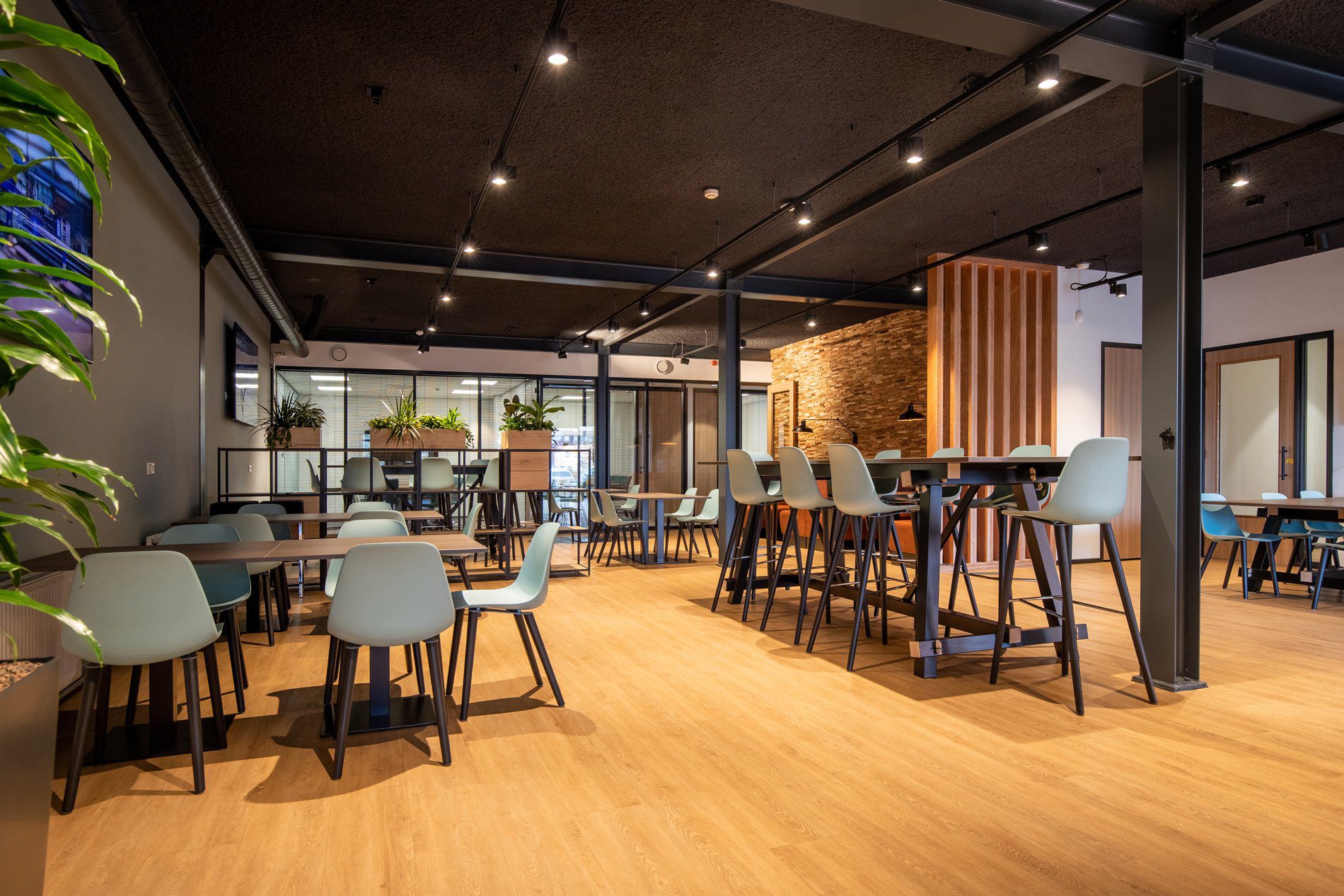 Een loods met hoge plafonds en een grote, massale ruimte verander je niet zomaar in een prettige werkomgeving. Om dat toch voor elkaar te krijgen creëerden we fijne werkplekken, gecombineerd met huiselijke ontspanningsplekken en een kantine. Door het zwarte plafond oogt de ruimte minder hoog. Daarnaast kozen we voor zwevende panelen met verlichting boven de bureaus en zitjes. De diverse open kasten ‘breken’ de ruimte zonder de openheid en overzichtelijkheid van de ruimte te verstoren. In de kantine combineerden we zitjes met verschillende hoogtes en kozen we voor een houten vloer en houten wand voor een natuurlijke uitstraling. Uiteraard leverden we een bijdrage aan een goede akoestiek, mede door het gebruik van vloerbedekking, planten en akoestische panelen.