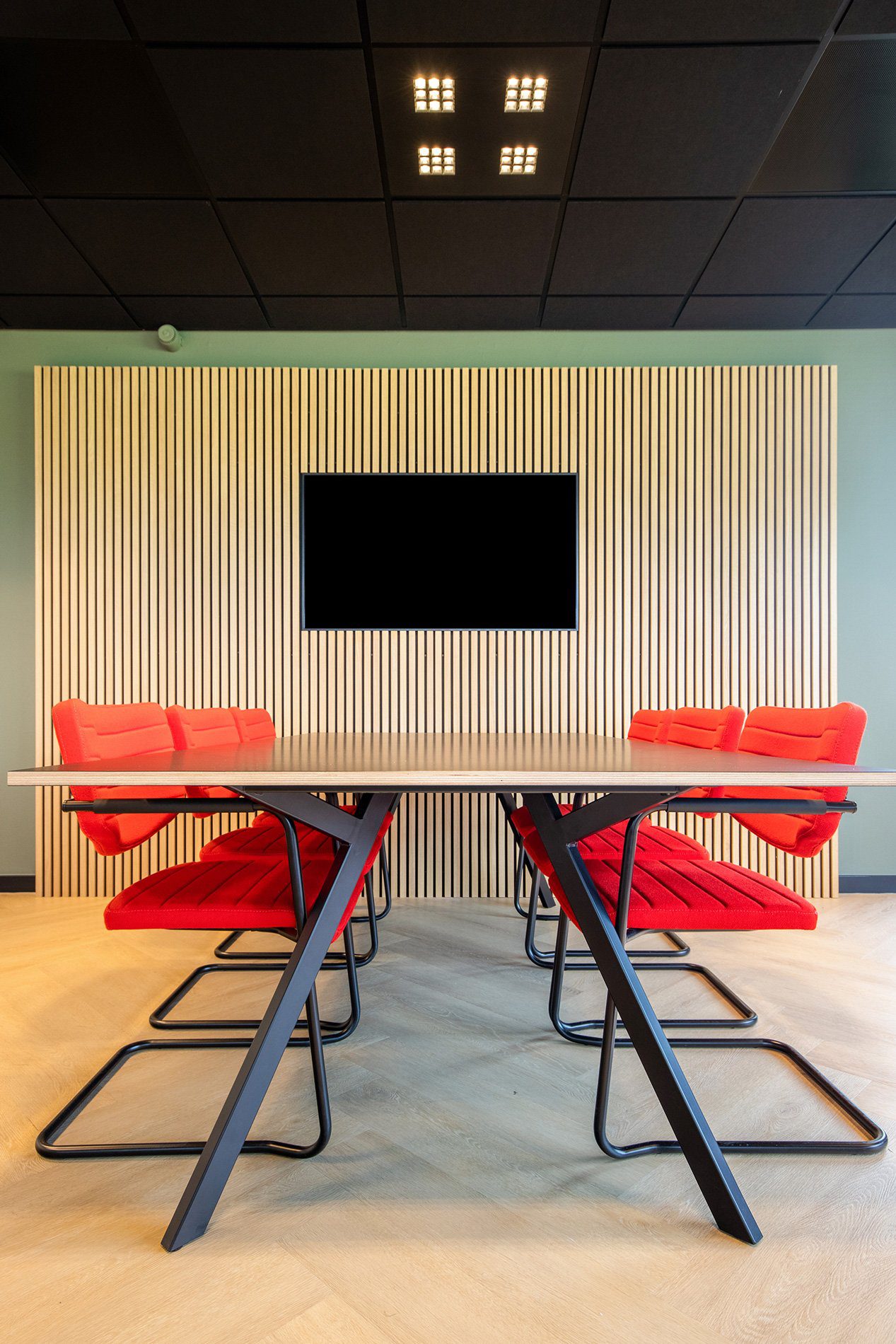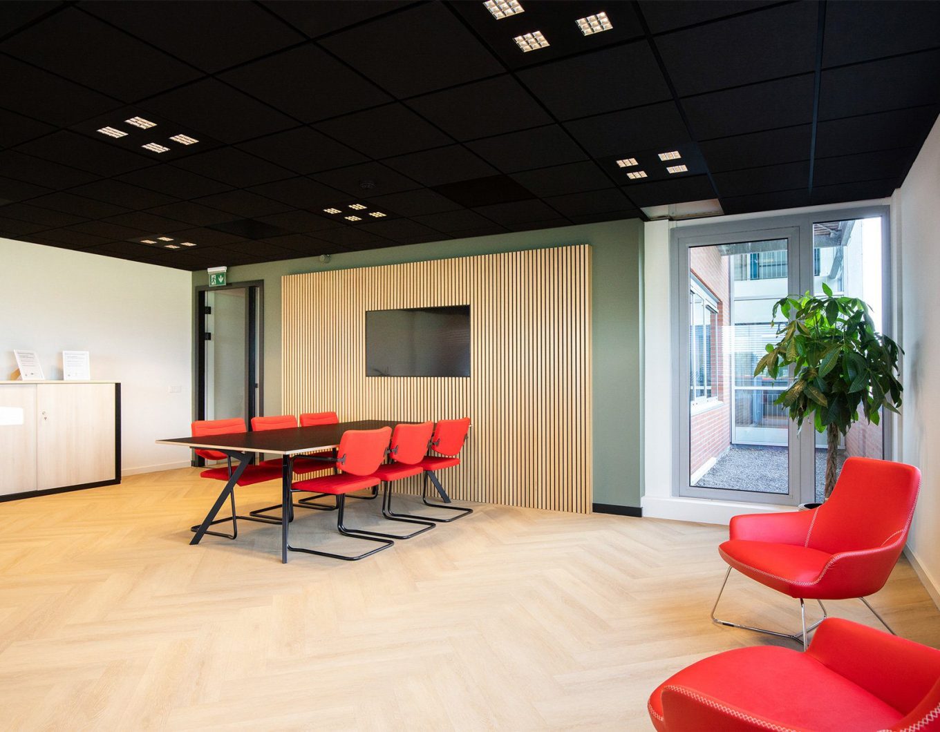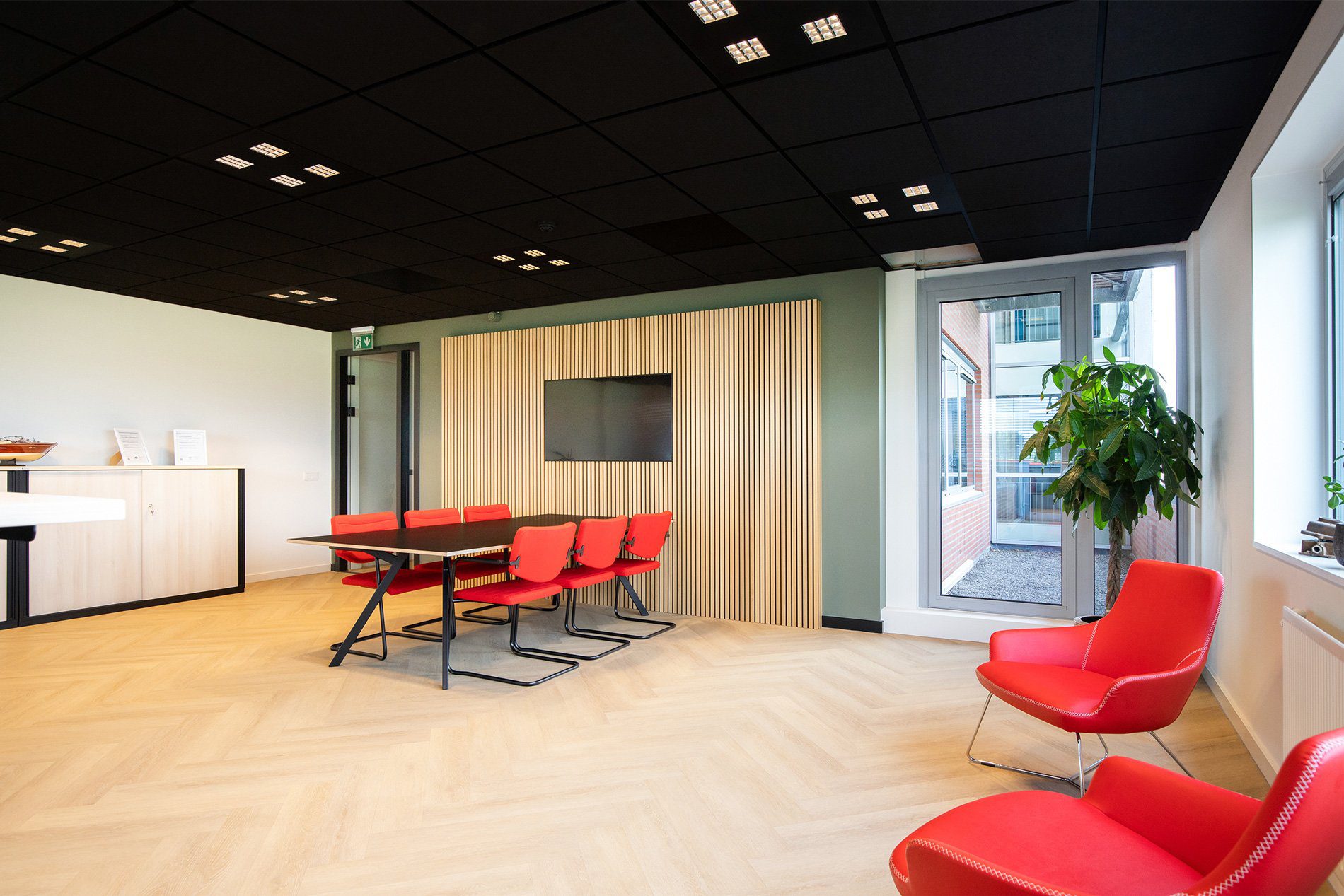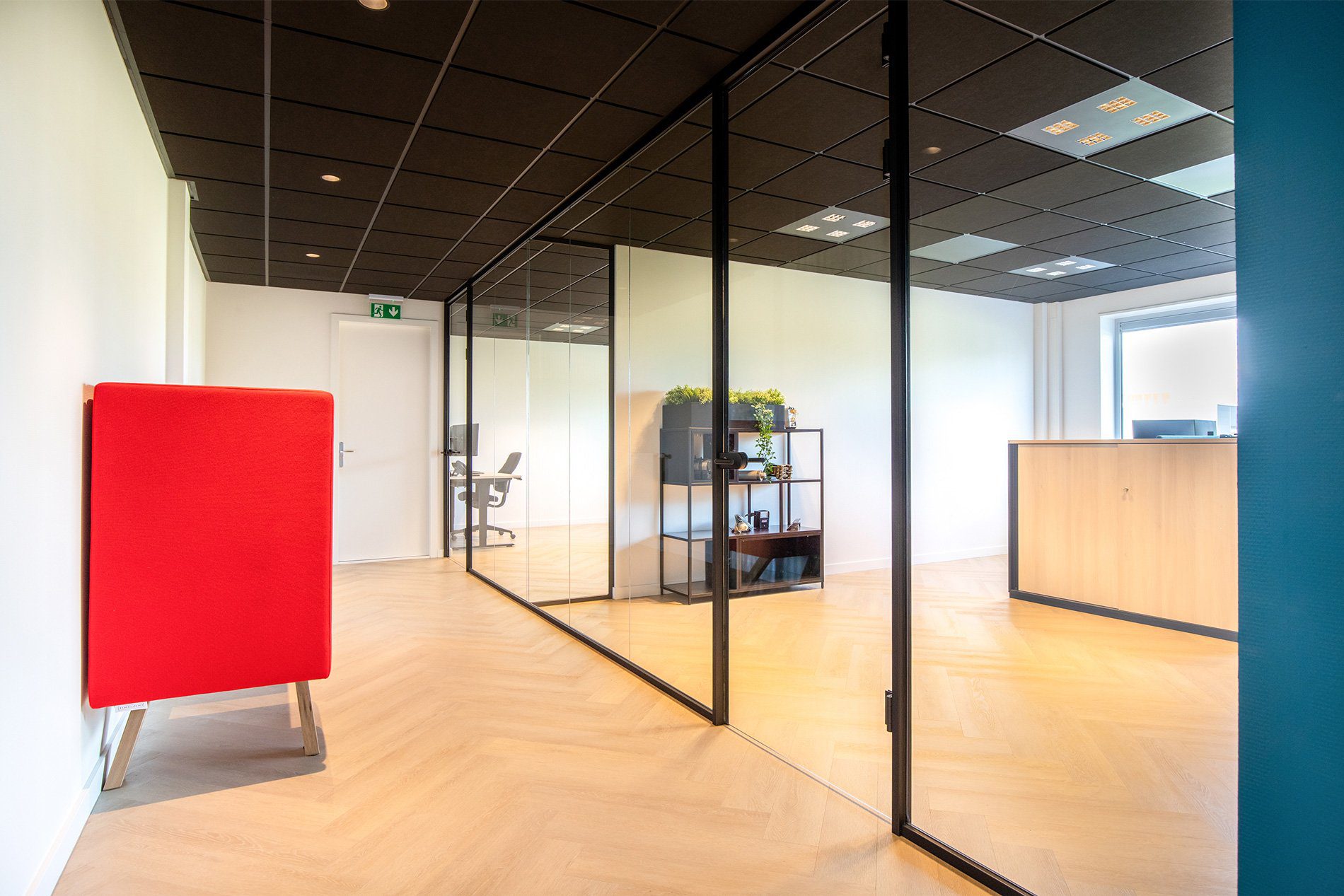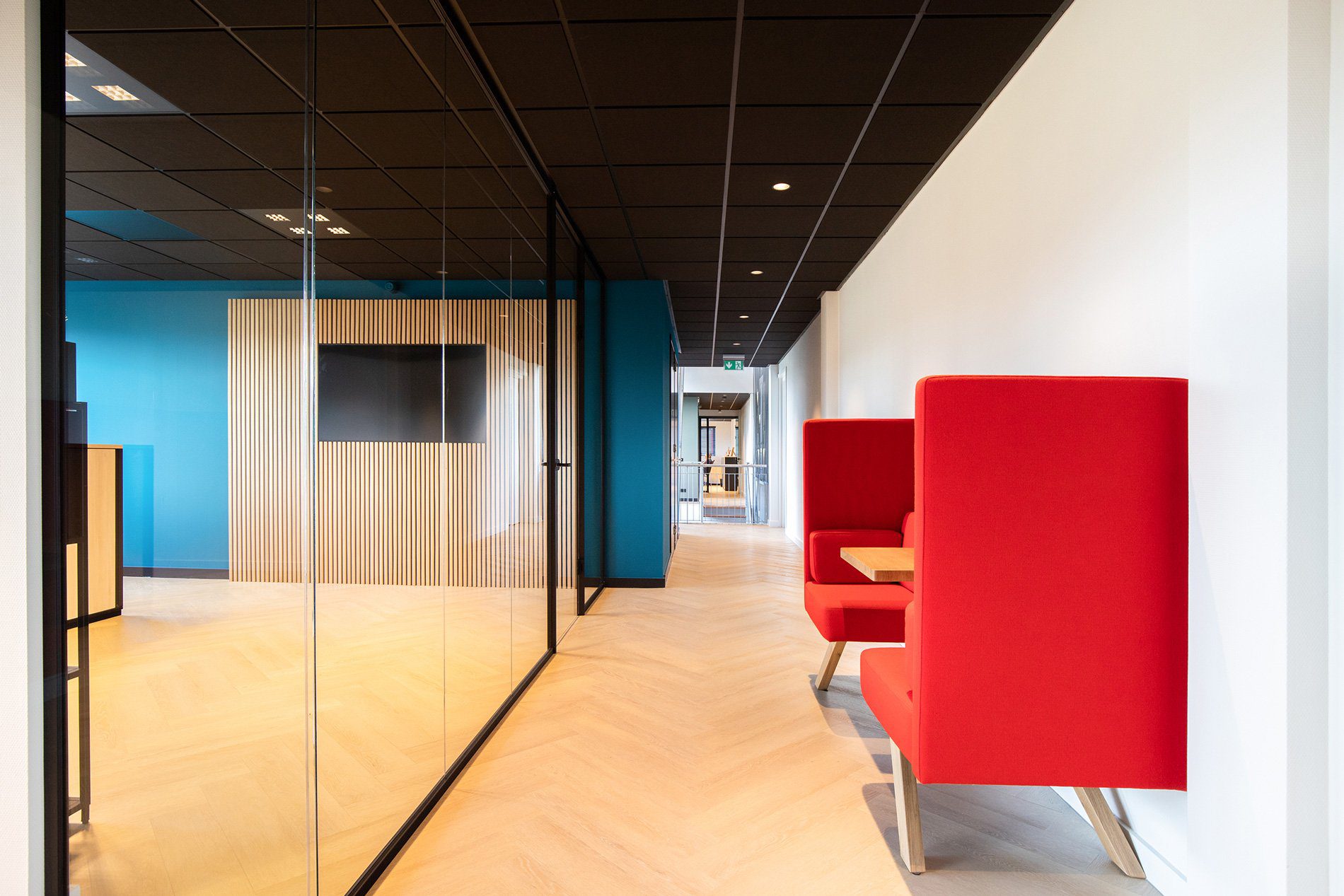 De visgraatvloer vormt een rustige basis. Het rood van EPC’s logo komt terug in de meubels en zorgt naast herkenbaarheid ook voor warmte. Door de plafonds een donkere kleur te geven, ogen de ruimtes direct knusser. Op de wanden kozen we voor het blauw in EPC’s huisstijl. We creëerden gezellige zitjes waar je je terug kunt trekken om even te bellen. Deze zitjes zorgen voor een nuttige en sfeervolle opvulling van loze ruimtes. De strakke glazen wanden zorgen voor licht, transparantie en eenheid. Beeldschermen werkten we weg in een houten wand.