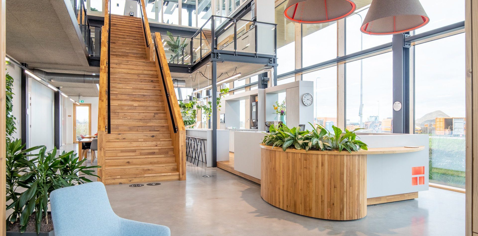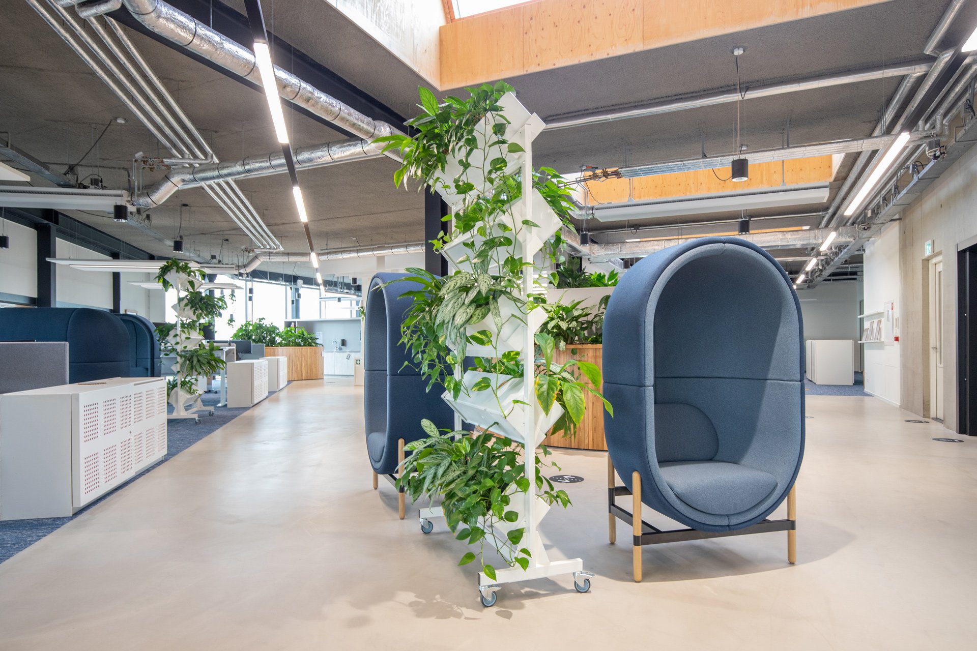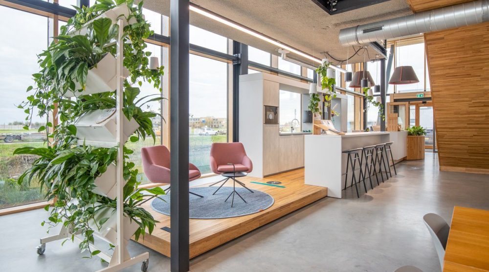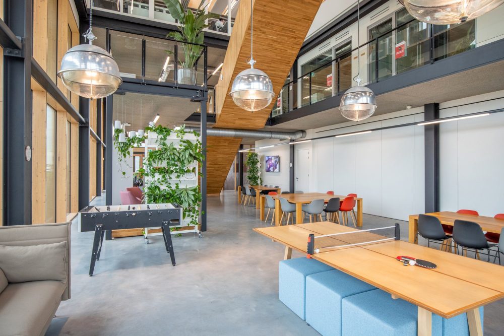 Het kantoor is helemaal door Heembouw zelf gebouwd en ontworpen vanuit een circulaire, duurzame en gezonde gedachte. Het concept: reduce, re-use en recycle. Ze voegden zo min mogelijk materiaal toe en als dat toch nodig was, gebruikten Ze gerecyclede materialen. De glazen wanden in de ruimte zijn afkomstig van een Amsterdams gebouw dat gesloopt werd. De lampen in de vide zijn oude straatlampen uit Leiden die zijn opgepoetst om hier opnieuw te kunnen stralen. Zelfs de tafeltennistafel is tweedehands en komt uit de showroom van een woonwinkel. De houten trap in het midden van het kantoor is een duurzame eyecatcher met een natuurlijke uitstraling. De diverse ‘groene’ accenten in de vorm van planten maken het plaatje compleet.