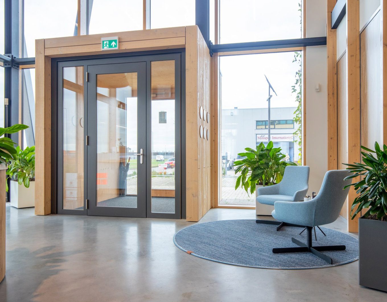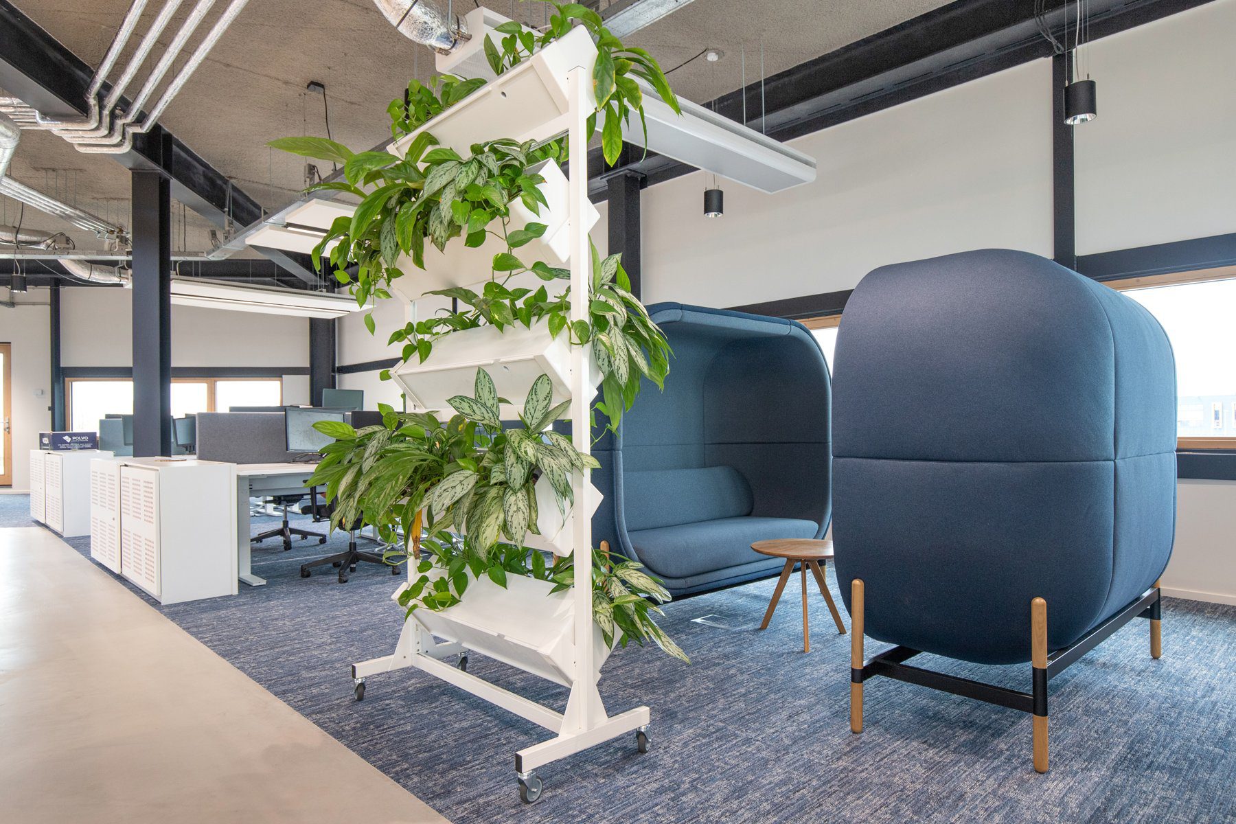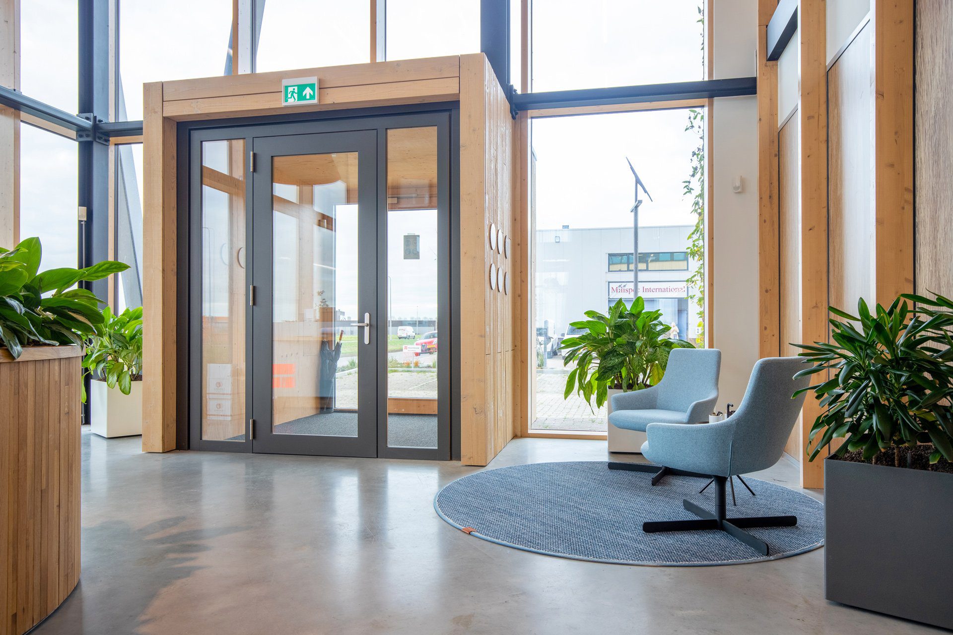 Het kantoor is helemaal door Heembouw zelf gebouwd en ontworpen vanuit een circulaire, duurzame en gezonde gedachte. Het concept: reduce, re-use en recycle. Ze voegden zo min mogelijk materiaal toe en als dat toch nodig was, gebruikten Ze gerecyclede materialen. De glazen wanden in de ruimte zijn afkomstig van een Amsterdams gebouw dat gesloopt werd. De lampen in de vide zijn oude straatlampen uit Leiden die zijn opgepoetst om hier opnieuw te kunnen stralen. Zelfs de tafeltennistafel is tweedehands en komt uit de showroom van een woonwinkel. De houten trap in het midden van het kantoor is een duurzame eyecatcher met een natuurlijke uitstraling. De diverse ‘groene’ accenten in de vorm van planten maken het plaatje compleet.