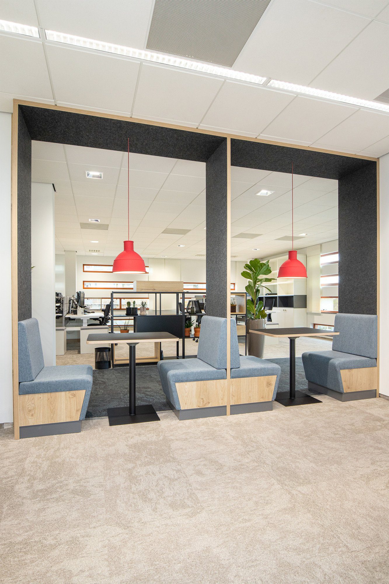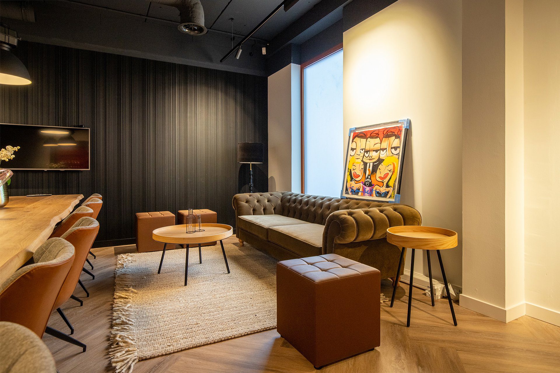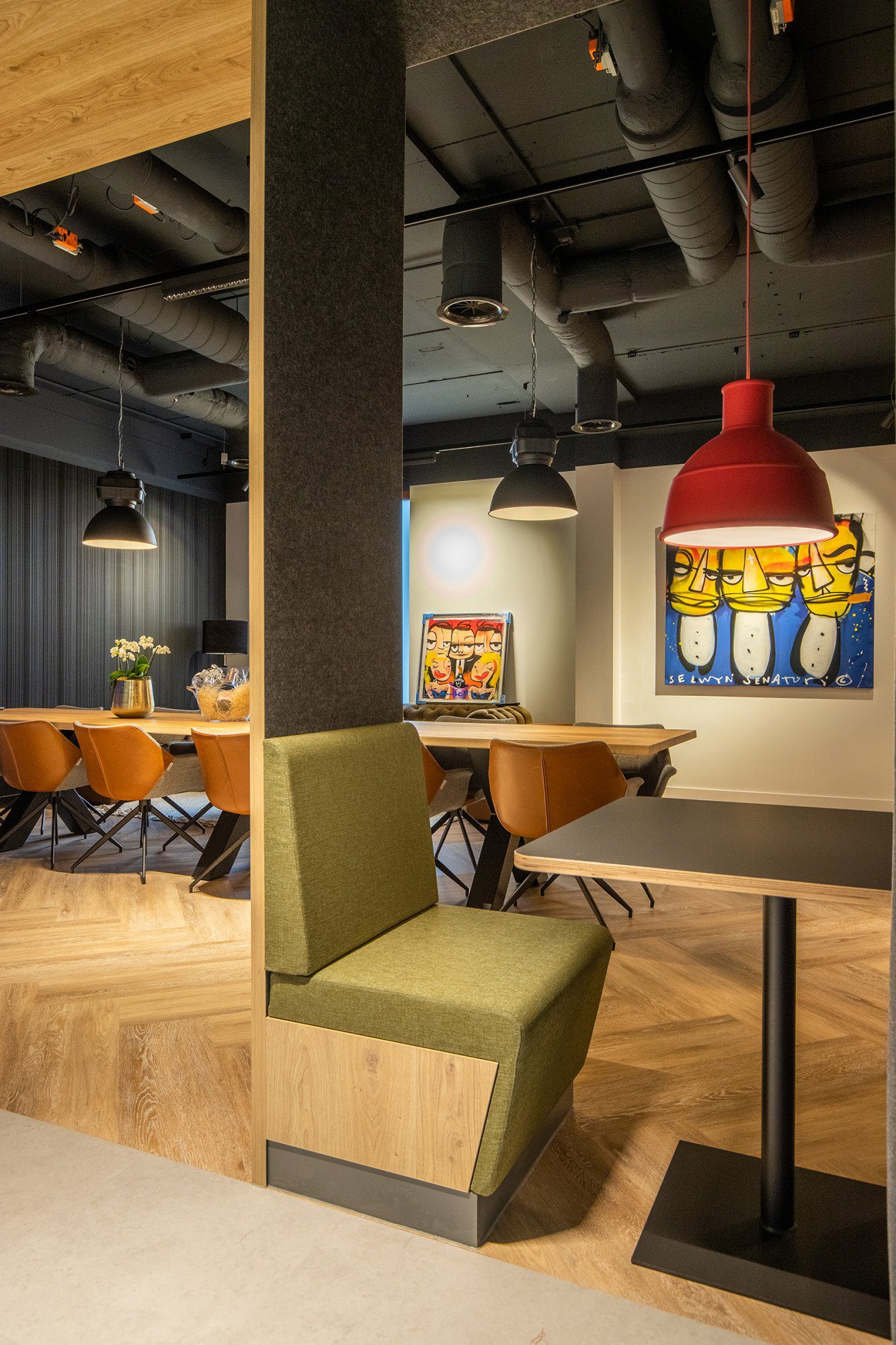 In het ontwerp kozen we voor natuurlijke materialen. Hout komt terug in verschillende tinten en op verschillende plaatsen: de vloer, de wand, de ontvangstbalie en het meubilair. Door de toepassing van vinylbehang in diverse kleuren ontstaan zones met een diversiteit aan sferen, zoals een informele sfeer in de kantine en de bar. In de kantoren creëerden we hier en daar nisjes met treinbanken als een open visuele afscheiding tussen de diverse afdelingen. Deze zitjes kunnen uiteraard ook worden gebruikt voor een overleg of belletje. Het zwarte plafond zorgt voor een warme uitstraling en maakt dat zelfs de grootste ruimtes knus aanvoelen.