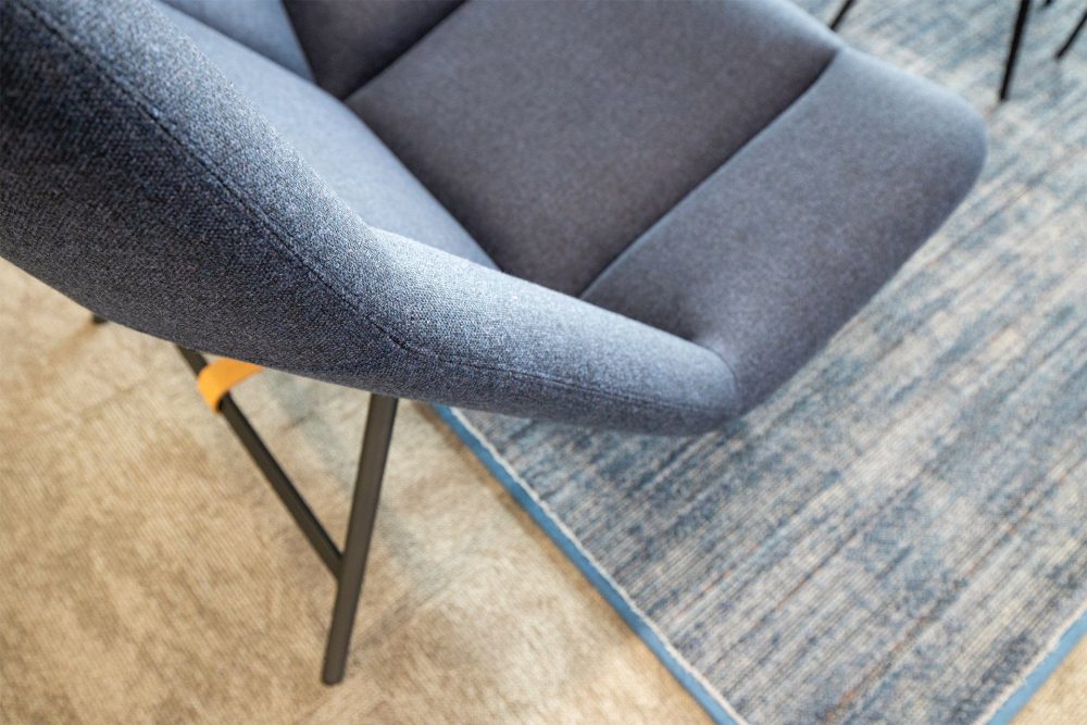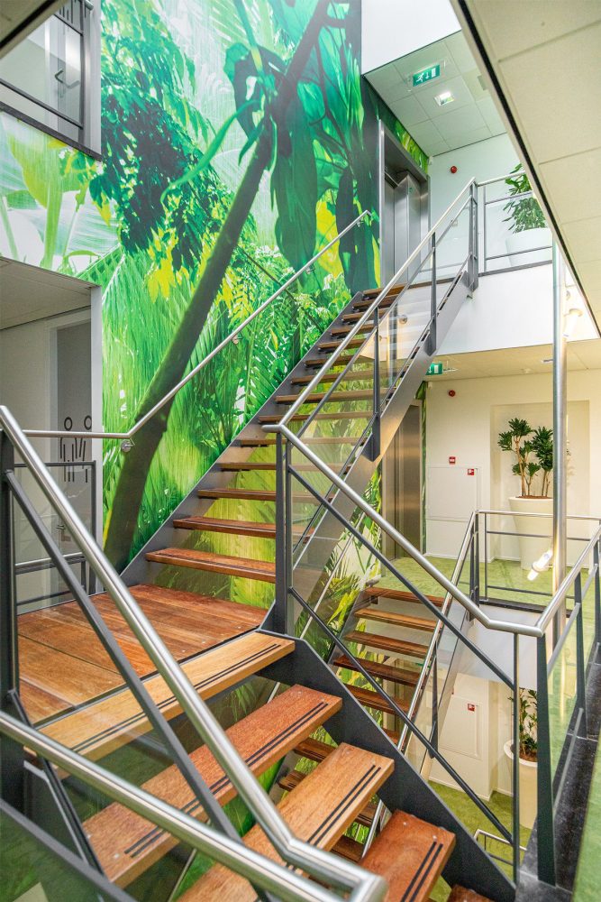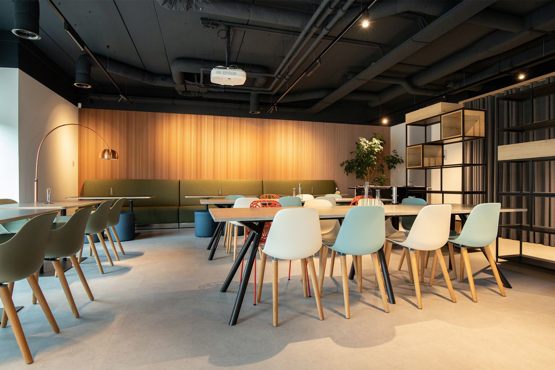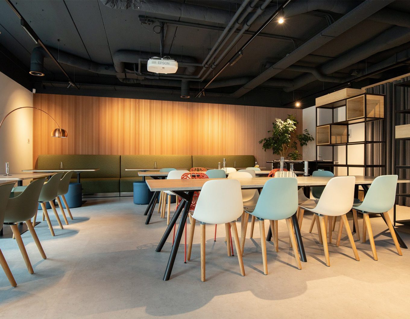 In het ontwerp kozen we voor natuurlijke materialen. Hout komt terug in verschillende tinten en op verschillende plaatsen: de vloer, de wand, de ontvangstbalie en het meubilair. Door de toepassing van vinylbehang in diverse kleuren ontstaan zones met een diversiteit aan sferen, zoals een informele sfeer in de kantine en de bar. In de kantoren creëerden we hier en daar nisjes met treinbanken als een open visuele afscheiding tussen de diverse afdelingen. Deze zitjes kunnen uiteraard ook worden gebruikt voor een overleg of belletje. Het zwarte plafond zorgt voor een warme uitstraling en maakt dat zelfs de grootste ruimtes knus aanvoelen.
