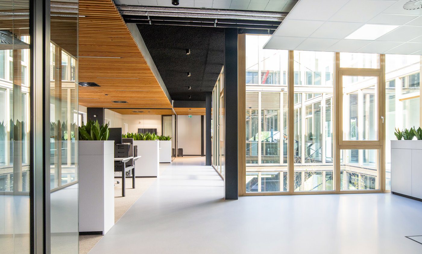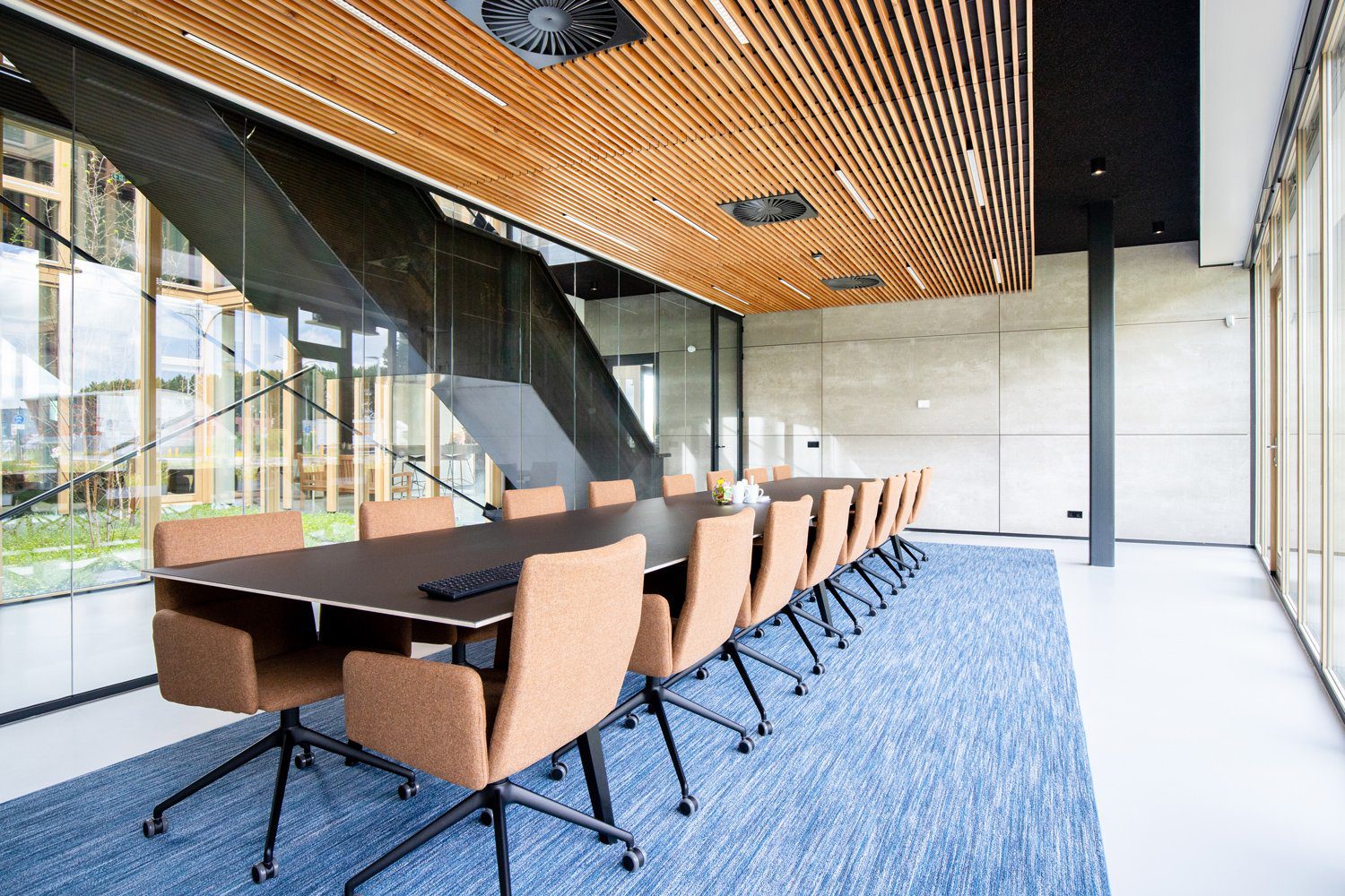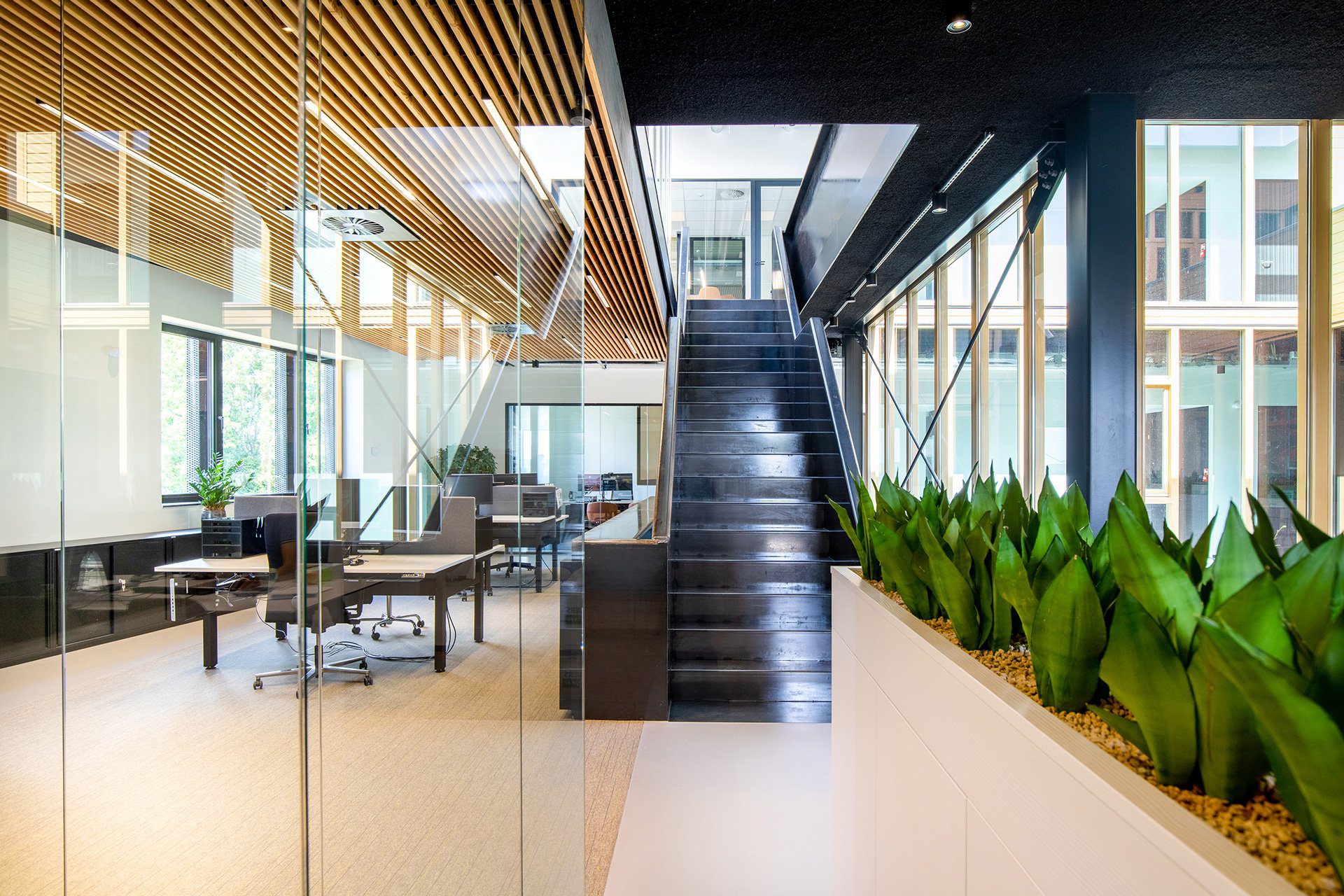 In het concept van de architect speelden zichtlijnen en transparantie een grote rol. Daarom lieten we hoog meubilair links liggen. Ook kozen we voor glazen wanden. In het midden bevindt zich een patio, een binnentuin. Zo wordt de grote open ruimte toch doorbroken en blijft de doorkijk behouden. Aan de buitenkant van het gebouw is de kleur geel gebruikt. De architect wilde deze op een subtiele manier ook binnen terug laten komen. Voor de directieruimtes kozen we voor een andere uitstraling en kleur: meer blauwtinten en net iets stoerder.
