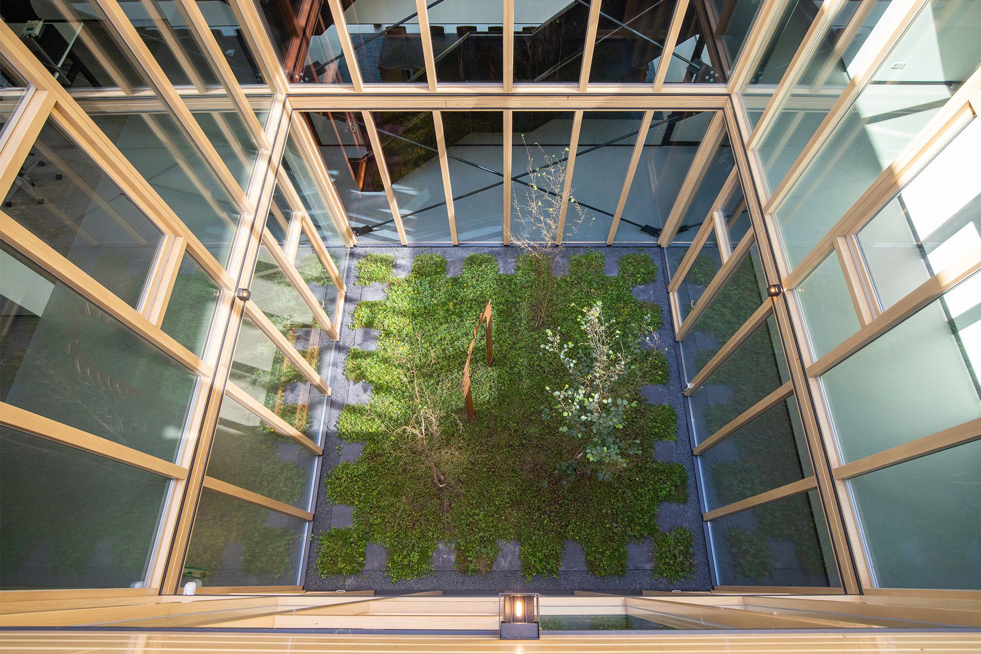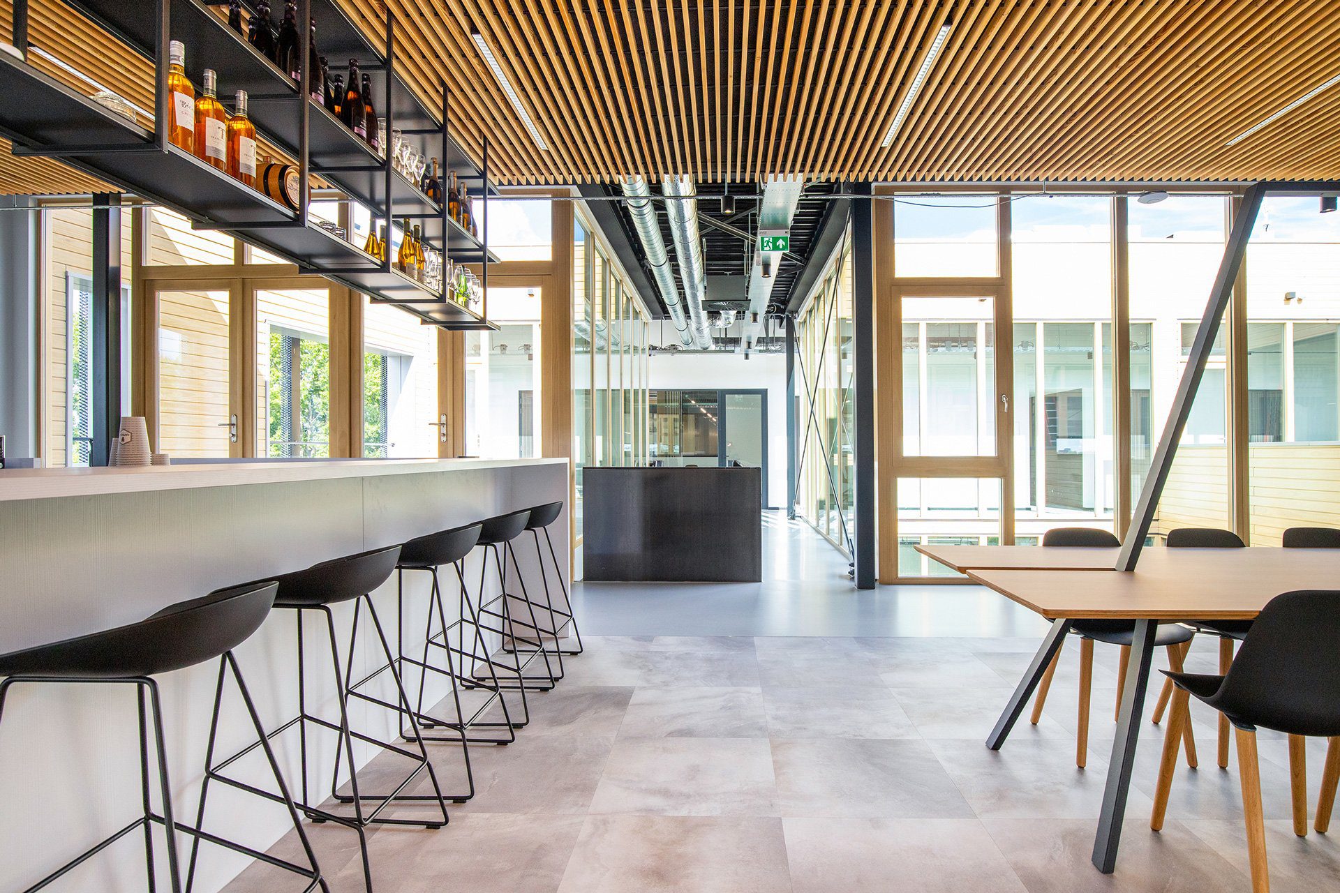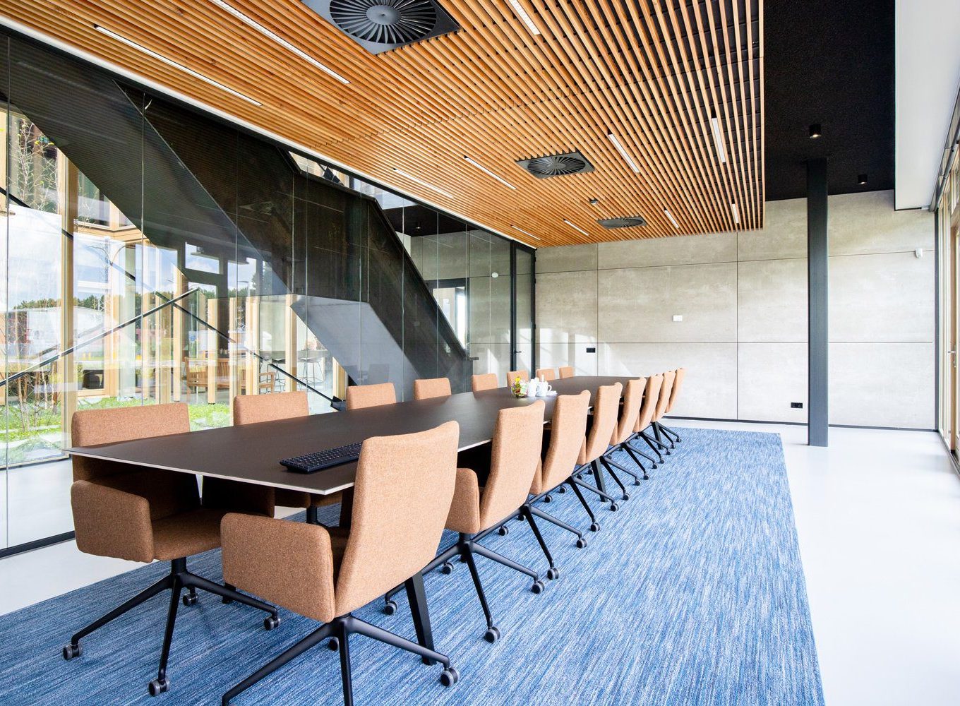 In het concept van de architect speelden zichtlijnen en transparantie een grote rol. Daarom lieten we hoog meubilair links liggen. Ook kozen we voor glazen wanden. In het midden bevindt zich een patio, een binnentuin. Zo wordt de grote open ruimte toch doorbroken en blijft de doorkijk behouden. Aan de buitenkant van het gebouw is de kleur geel gebruikt. De architect wilde deze op een subtiele manier ook binnen terug laten komen. Voor de directieruimtes kozen we voor een andere uitstraling en kleur: meer blauwtinten en net iets stoerder.