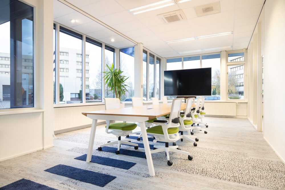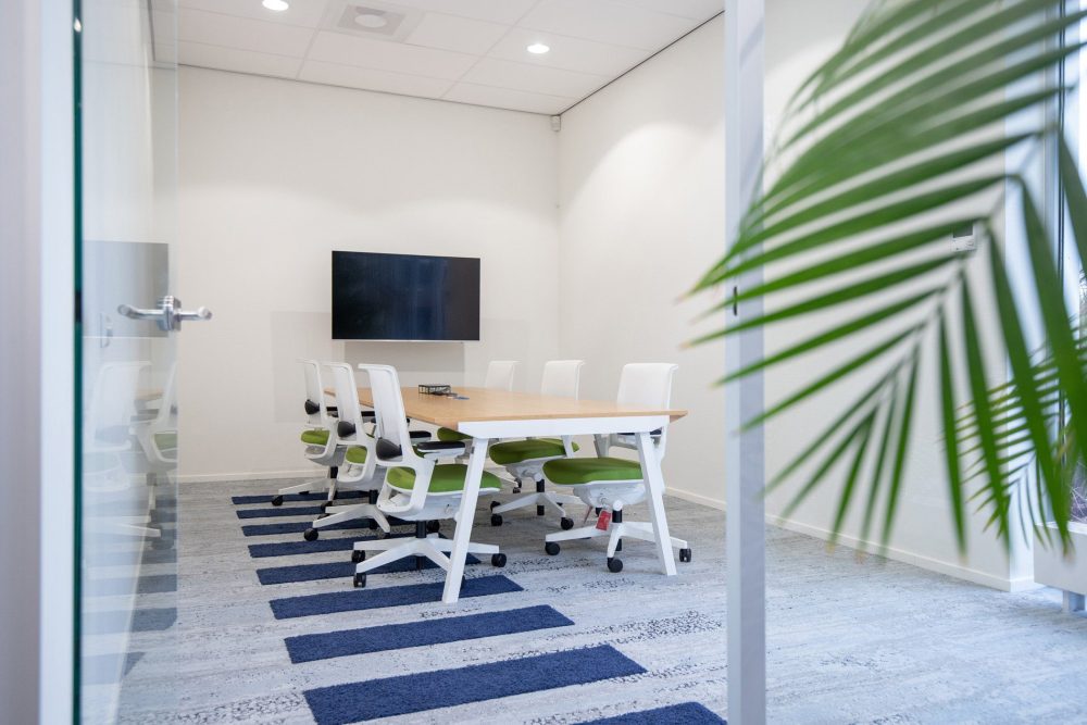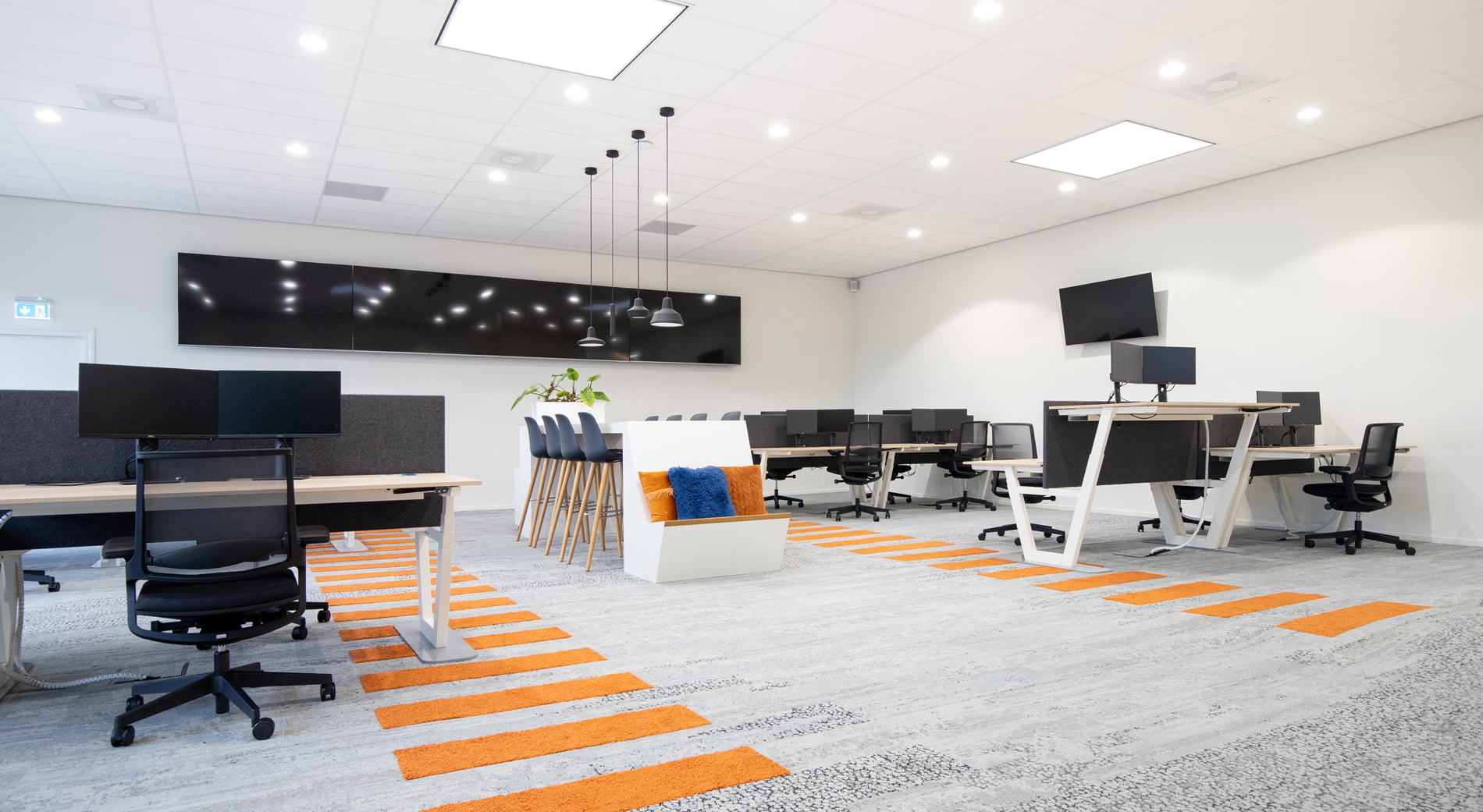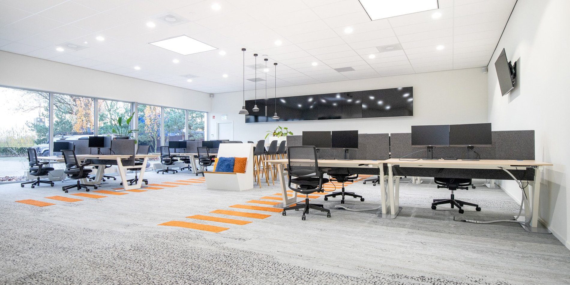 In het voorstel maakten we een opstelling met geluidswerende schermen, in hoogte verstelbare bureaus en een centraal punt voor de dashboards waar de engineers van Tredion goed kunnen samenwerken. Ook creëerden we een overlegplek met glazen wanden. De vloerbedekking geeft het interieur een warmere uitstraling. We sloten aan op de stijl die er al was binnen de rest van het pand, maar gaven hier wel een eigen touch aan. Net even anders dan standaard, wat goed past bij Tredion.