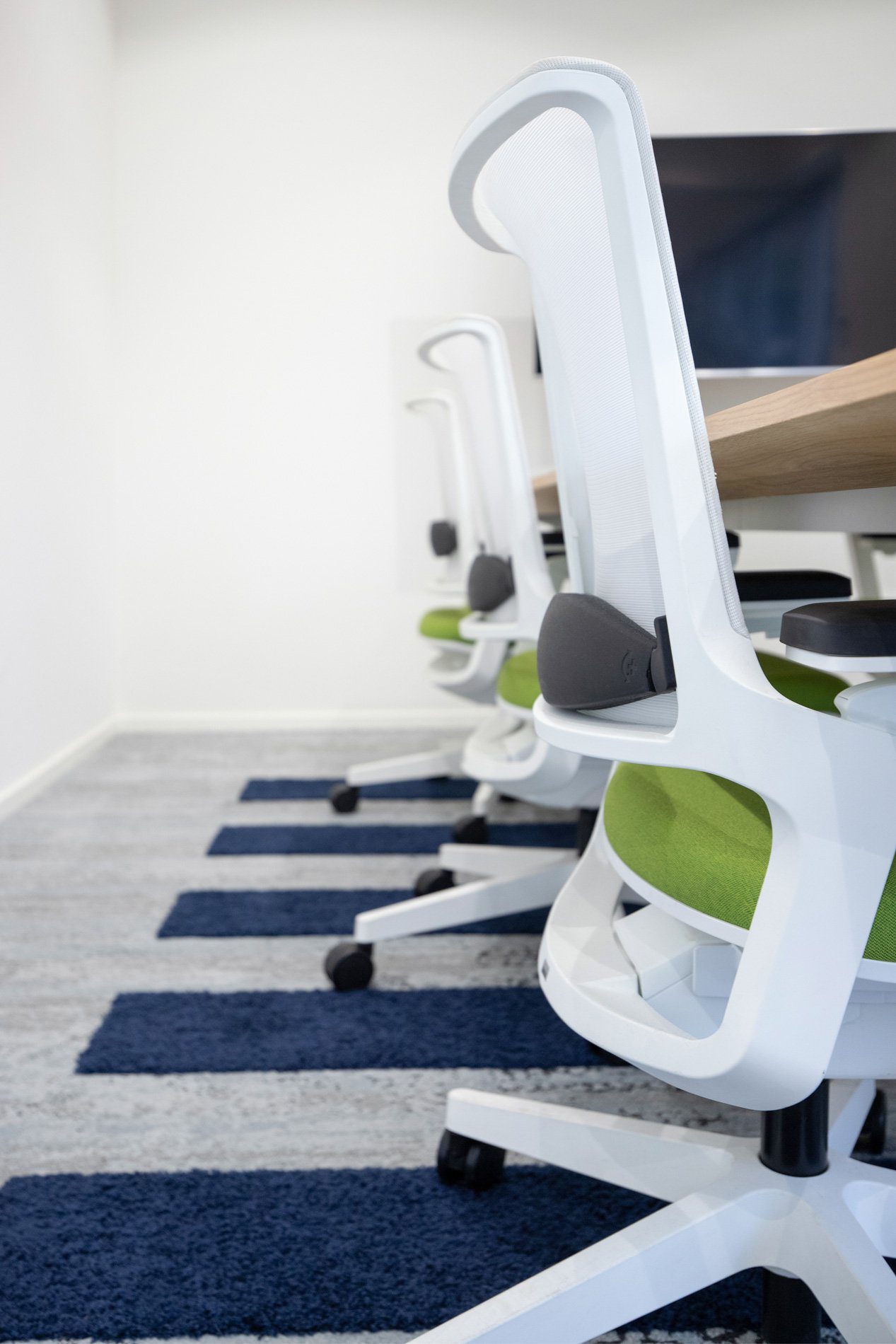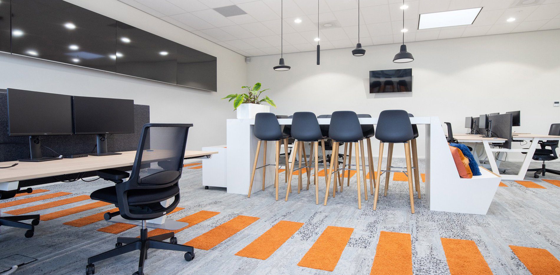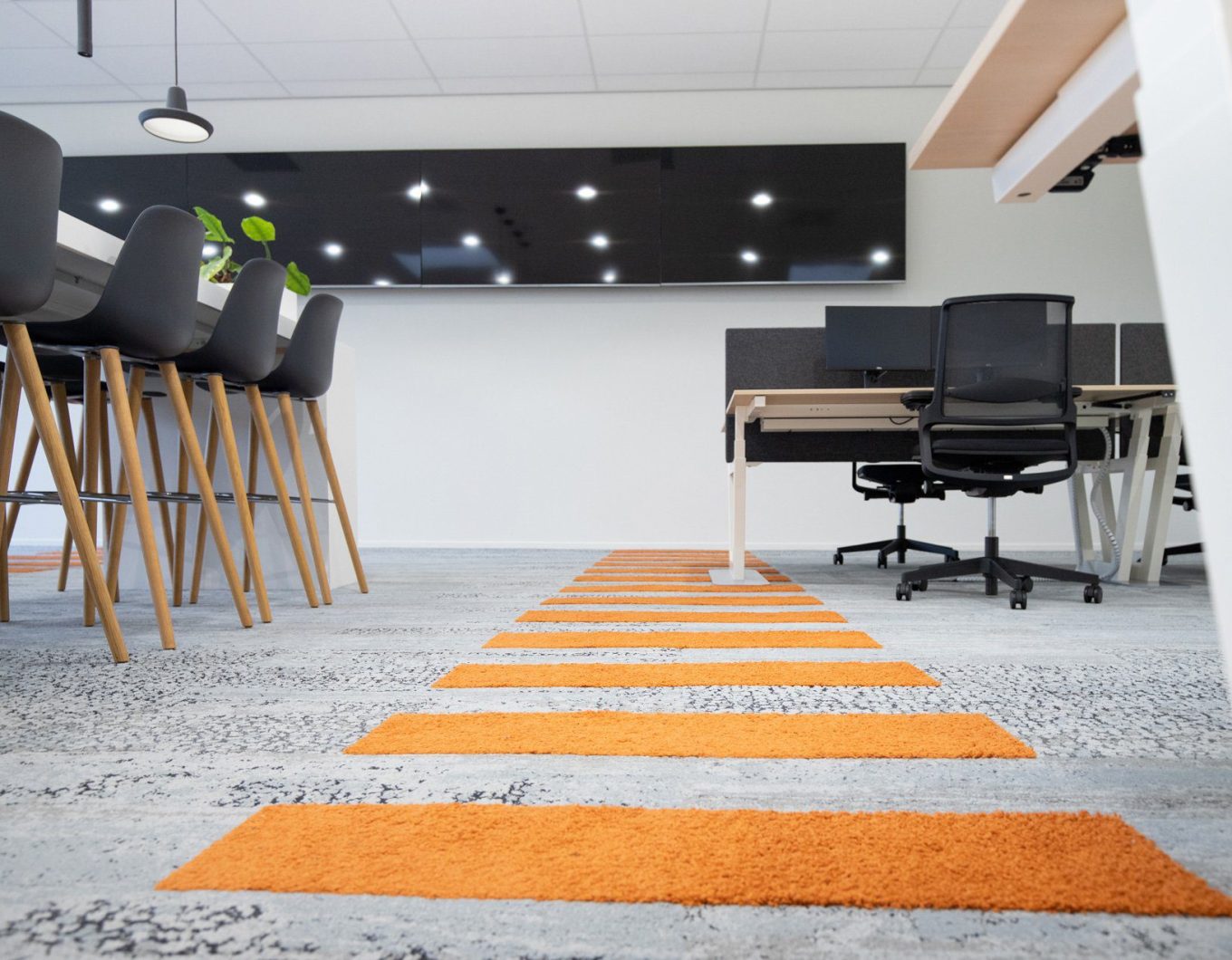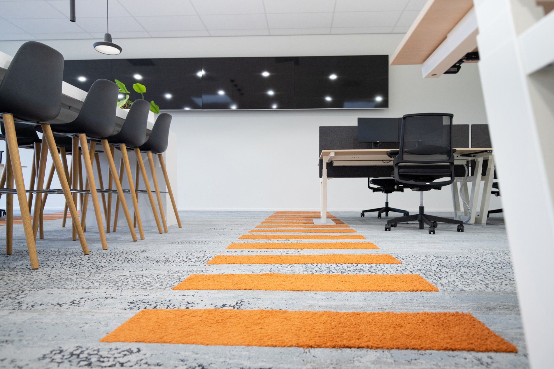 In het voorstel maakten we een opstelling met geluidswerende schermen, in hoogte verstelbare bureaus en een centraal punt voor de dashboards waar de engineers van Tredion goed kunnen samenwerken. Ook creëerden we een overlegplek met glazen wanden. De vloerbedekking geeft het interieur een warmere uitstraling. We sloten aan op de stijl die er al was binnen de rest van het pand, maar gaven hier wel een eigen touch aan. Net even anders dan standaard, wat goed past bij Tredion.