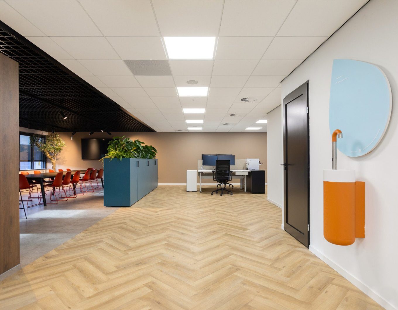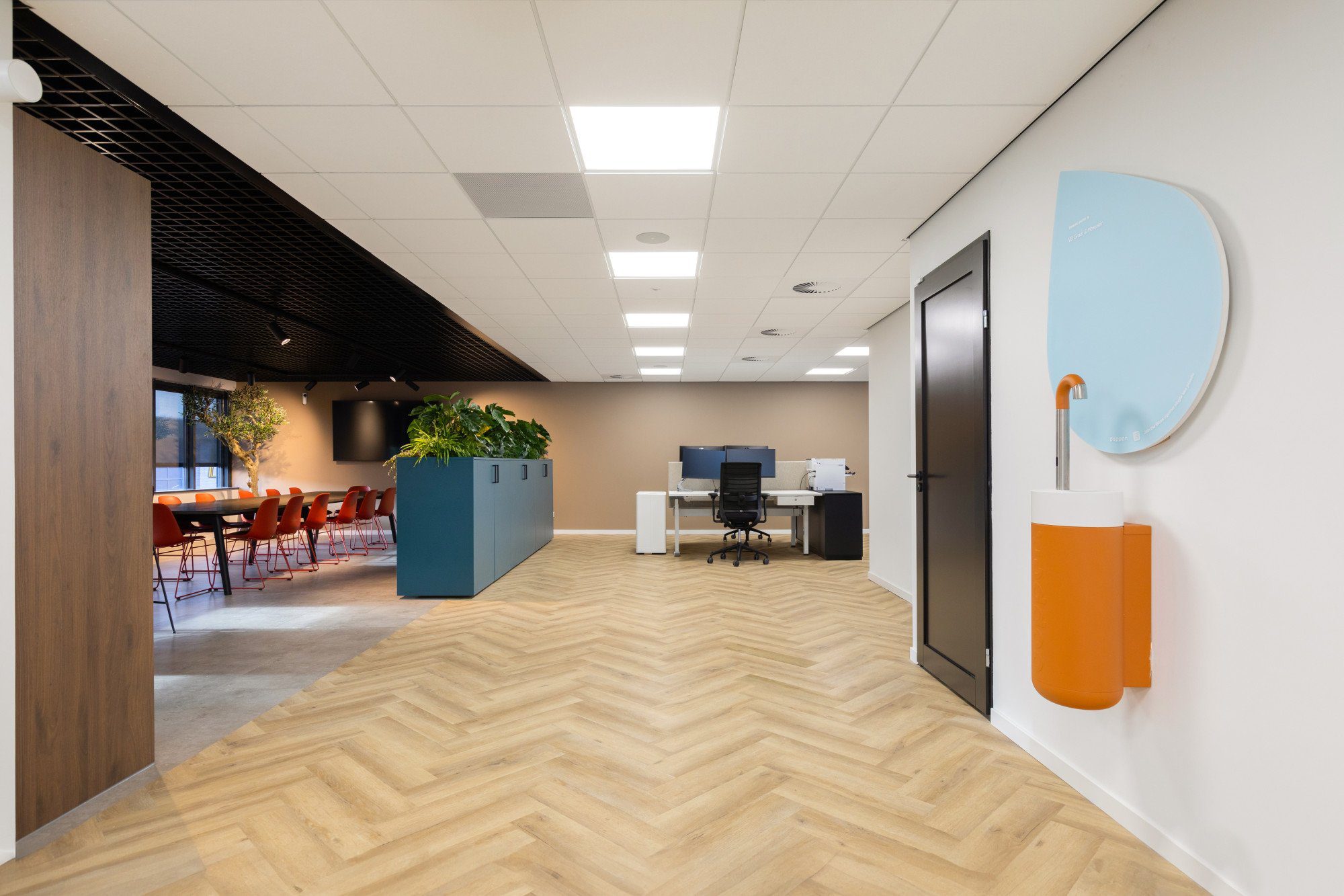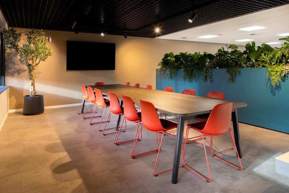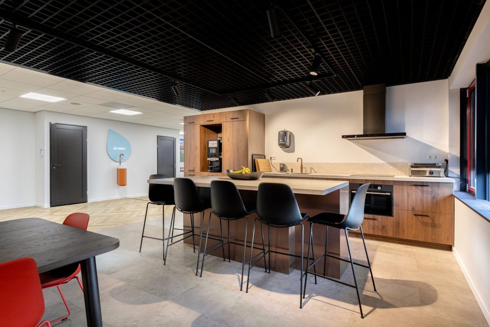 VDGM kocht de eerste verdieping van het gebouw dat grensde aan dat van hen. Ze sloopten de tussenwand tussen de twee panden, om zo één grote eerste verdieping te creëren. Aan de ene zijde kwamen de werkplekken, het vergadermeubilair en de directieruimte. Aan de andere kant kwam een spreekruimte, nog wat werkplekken en een grote kantine. Wij plaatsten een glaswand en verzorgden de interieurbouw in de kantine voor de keuken en de pantry. We voorzagen de plafonds in de kantine en spreekruimte van een zwart, stalen raster dat een hele gave industriële uitstraling geeft. Ook leverden we de audiovisuele middelen in de vorm van presentatieschermen met teamsoplossing en een audiosysteem. Met dit audiosysteem kunnen ze door het hele pand genieten van muziek. Zo wordt de vrijmibo toch nét nog iets gezelliger!