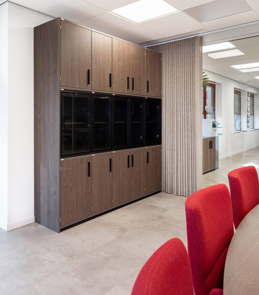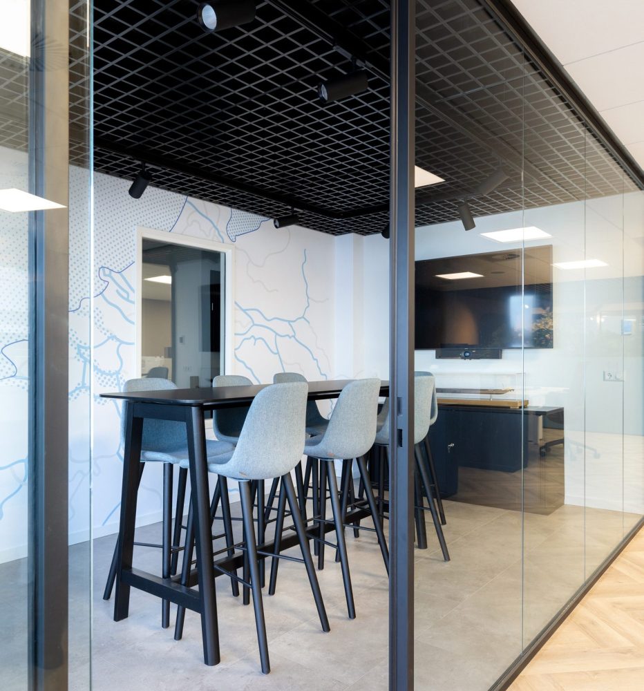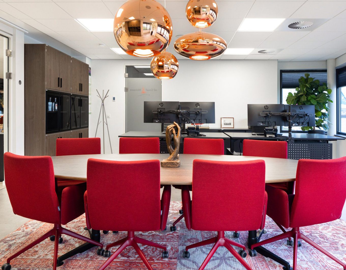 VDGM kocht de eerste verdieping van het gebouw dat grensde aan dat van hen. Ze sloopten de tussenwand tussen de twee panden, om zo één grote eerste verdieping te creëren. Aan de ene zijde kwamen de werkplekken, het vergadermeubilair en de directieruimte. Aan de andere kant kwam een spreekruimte, nog wat werkplekken en een grote kantine. Wij plaatsten een glaswand en verzorgden de interieurbouw in de kantine voor de keuken en de pantry. We voorzagen de plafonds in de kantine en spreekruimte van een zwart, stalen raster dat een hele gave industriële uitstraling geeft. Ook leverden we de audiovisuele middelen in de vorm van presentatieschermen met teamsoplossing en een audiosysteem. Met dit audiosysteem kunnen ze door het hele pand genieten van muziek. Zo wordt de vrijmibo toch nét nog iets gezelliger!
