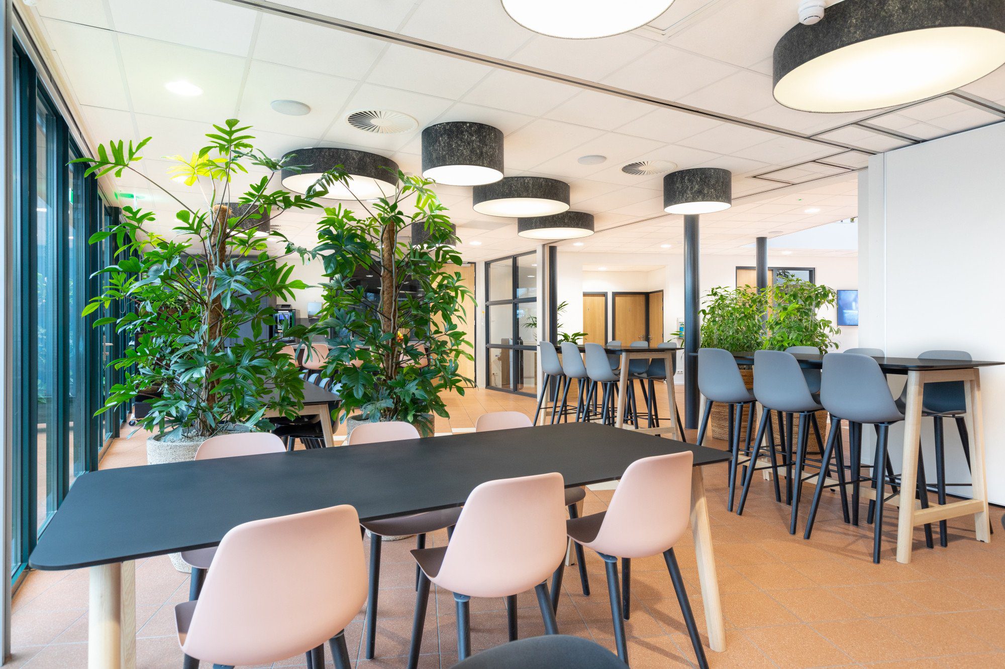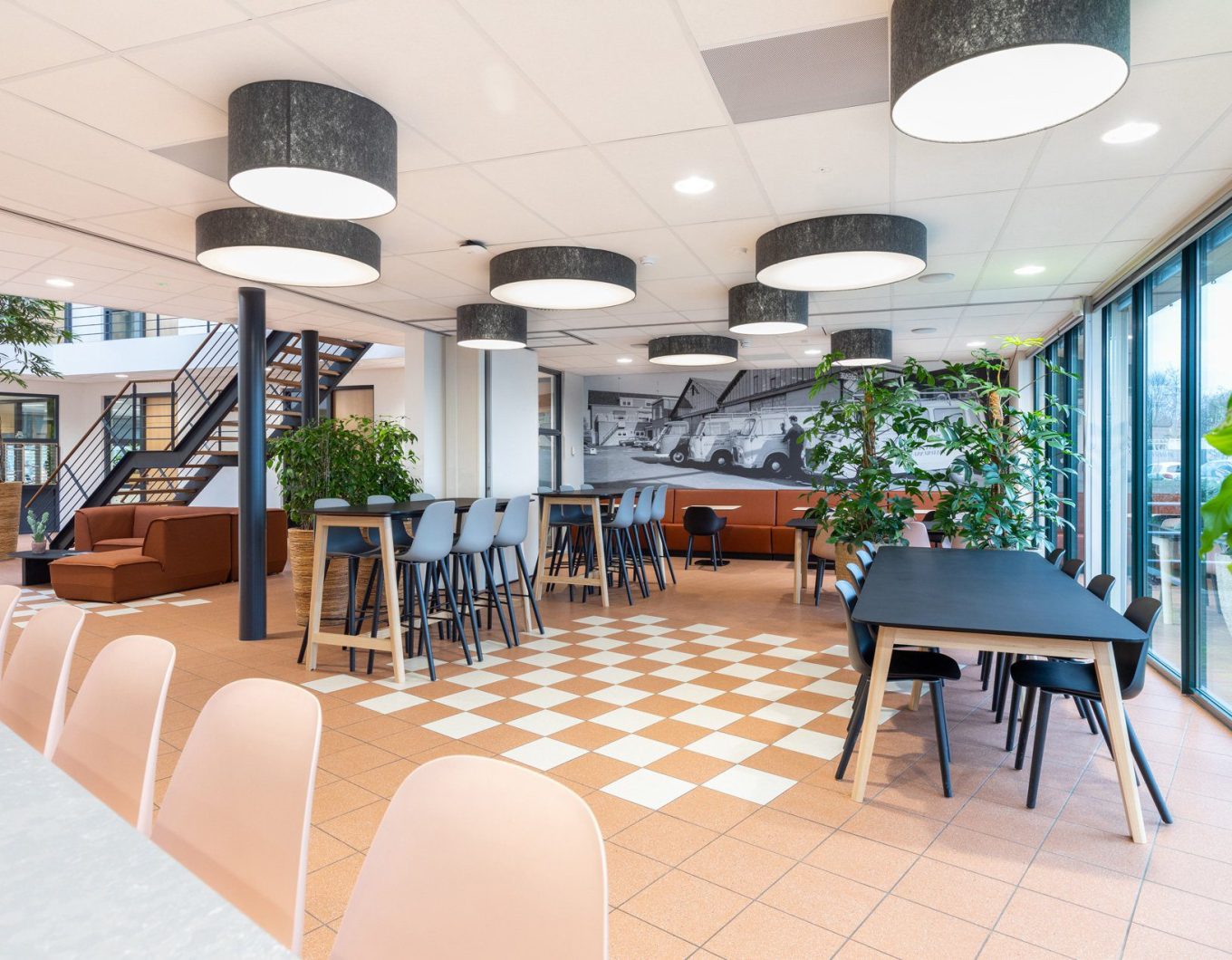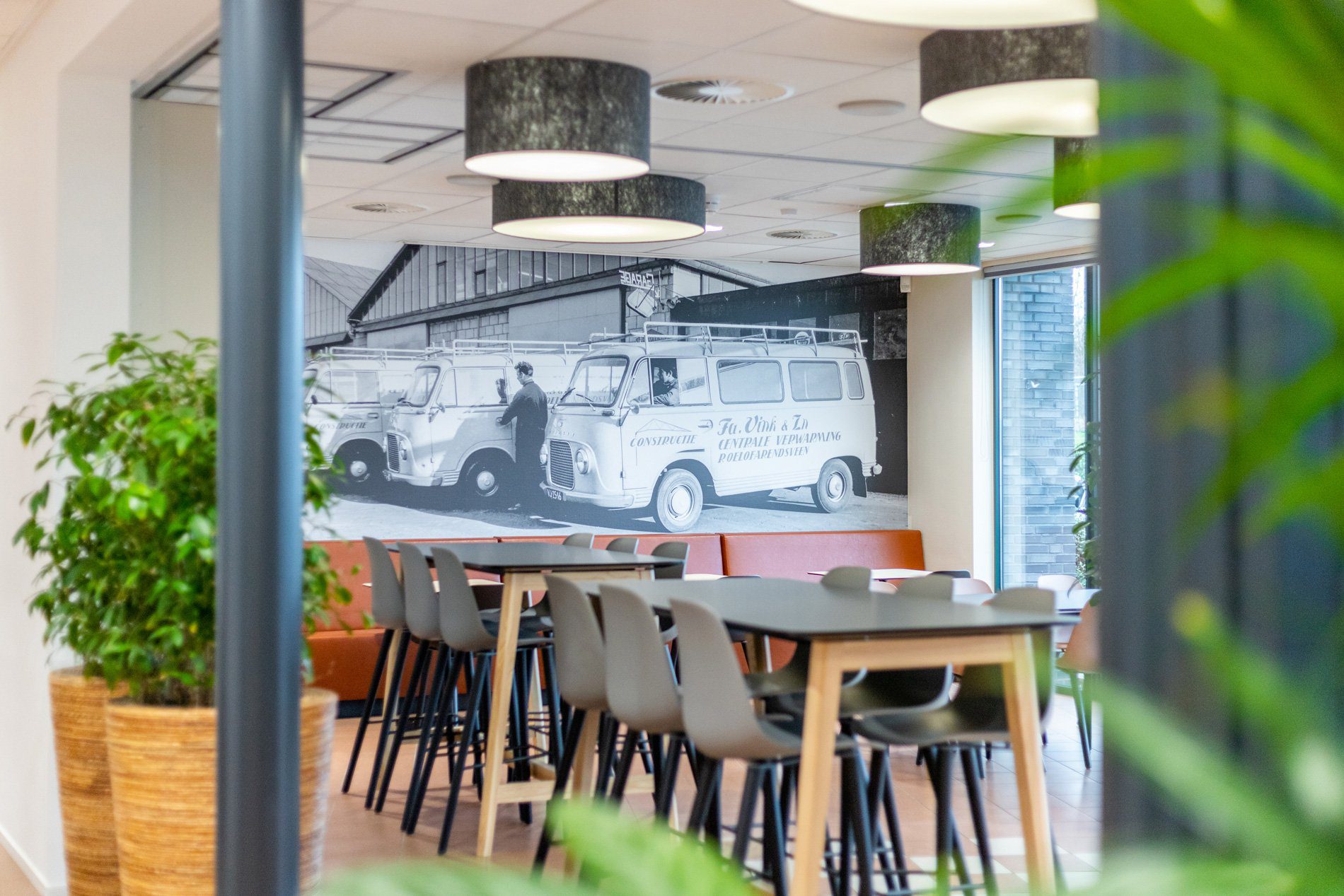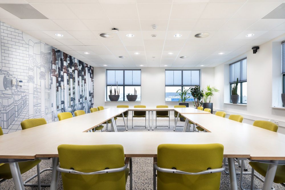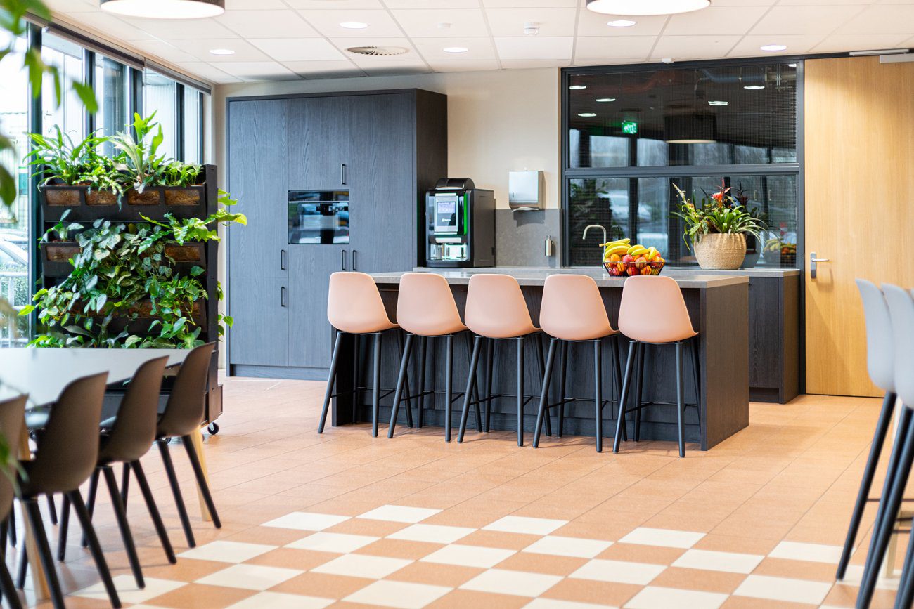 Bij de invulling van het ontwerp streefden we naar hergebruik van materialen en producten. We gebruikten bestaande vergaderstoelen. Oude krukjes voorzagen we van een nieuwe stof en bestaande frames van een nieuw tafelblad, zodat ze naadloos pasten in het interieur en weer jaren mee kunnen. Budgetvriendelijk én duurzaam!