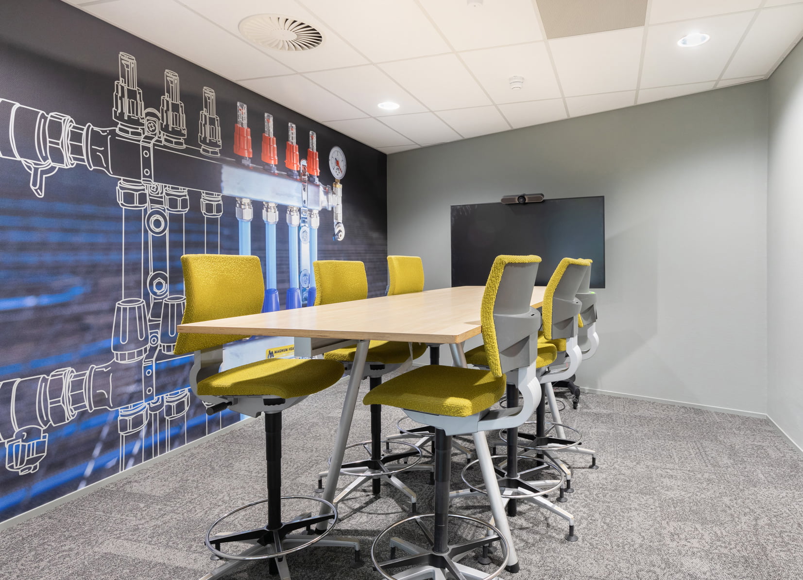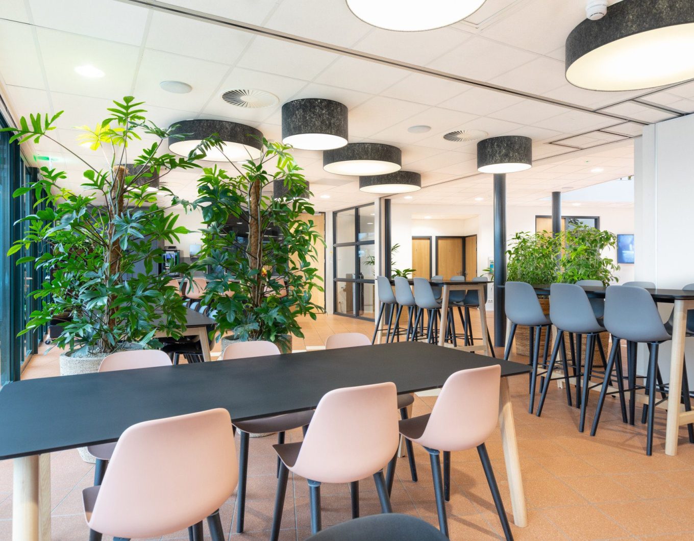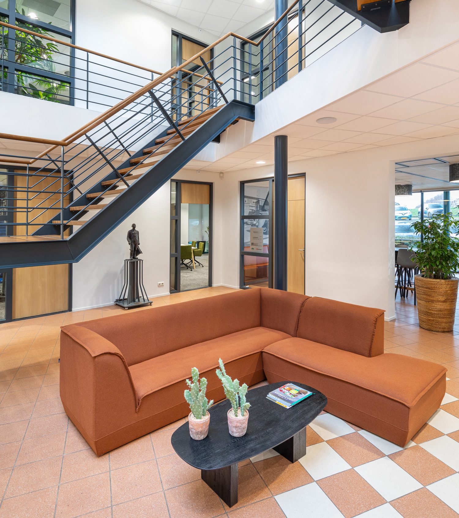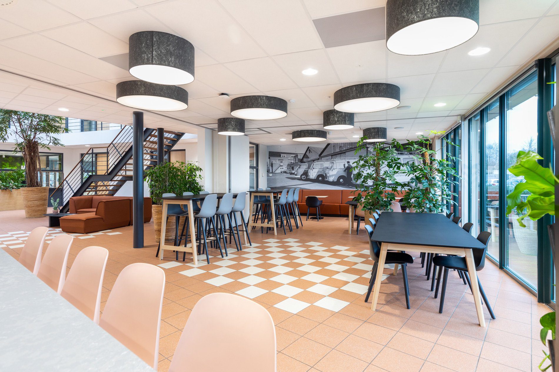 Bij de invulling van het ontwerp streefden we naar hergebruik van materialen en producten. We gebruikten bestaande vergaderstoelen. Oude krukjes voorzagen we van een nieuwe stof en bestaande frames van een nieuw tafelblad, zodat ze naadloos pasten in het interieur en weer jaren mee kunnen. Budgetvriendelijk én duurzaam!
